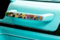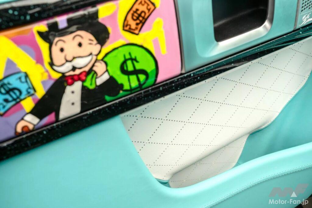 そしてキャビン。鮮やかなターコイズブルーのレザーに、ホワイトのパイピングとアクセントがあしらわれている。さらに、緑、水色、黄色、紫の不揃いなシートベルト、カスタムペイントされたエアベント、そしてモノポリーのアート作品の数々が散りばめられているのも特徴だ。