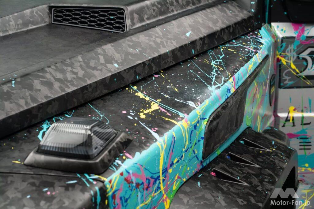 アートワークに関しては、アレック・モノポリーが渾身の力を発揮し、Gクラスのボディ側面をモノポリーのボードゲームのシンボルで覆い尽くしている。ドアやクォーターパネルにはネオンカラーの鮮やかな彩りが散りばめられ、ボードゲームが現実離れしたシュールな熱狂の夢を彷彿とさせる。エクステリアのハイライトは、リアのスペアホイールカバーだろう。