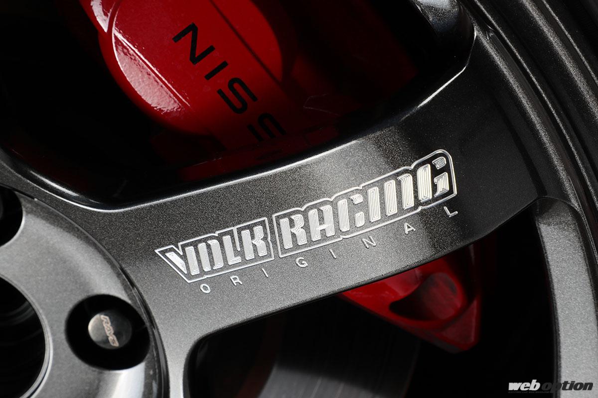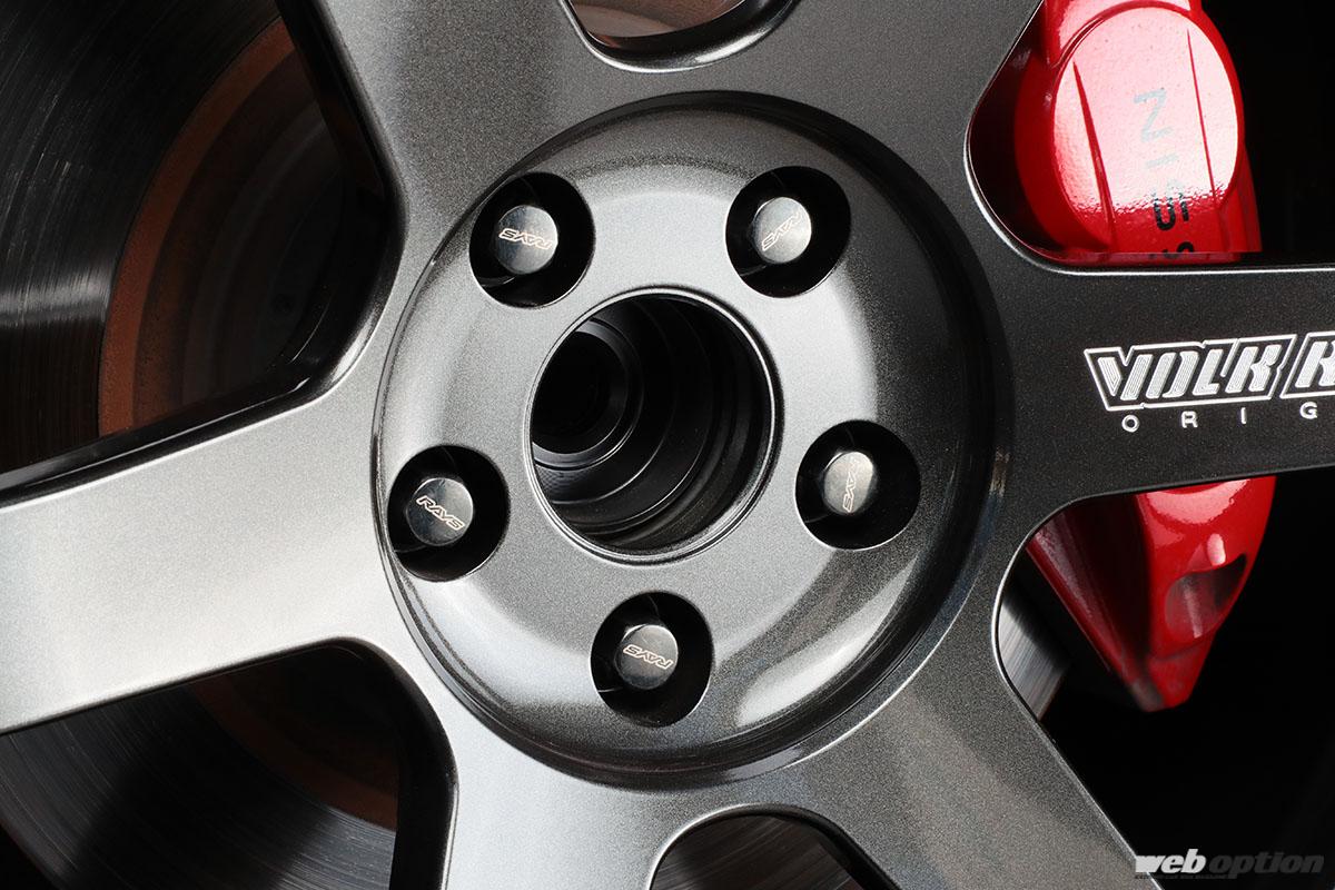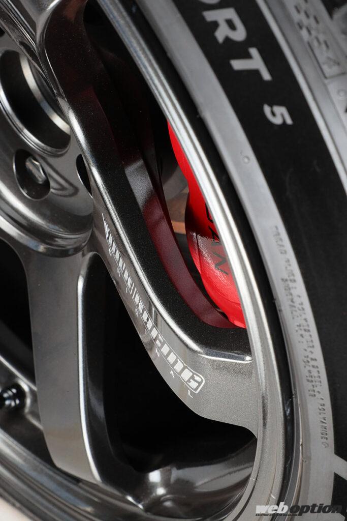スポークサイドにうっすらと走るプレスラインが、レーシングコンケイブとともに足元の深みをアピール。RZ34純正19インチ仕様の4ポットキャリパーでも、フェイス4ならクリアランスは十二分だ。
