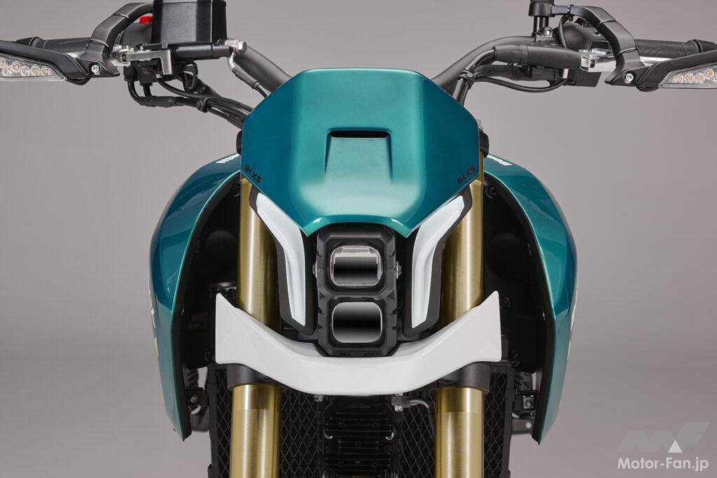 プリロード・減衰の調整が可能な倒立型Φ41mmフロントフォークのストローク量は、オンロード走行及びオフロード走行の両方を想定したBKX300(180mm)よりも30mm短い、レスポンスに優れたショート仕様の150mmに設定。