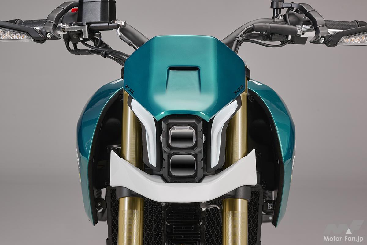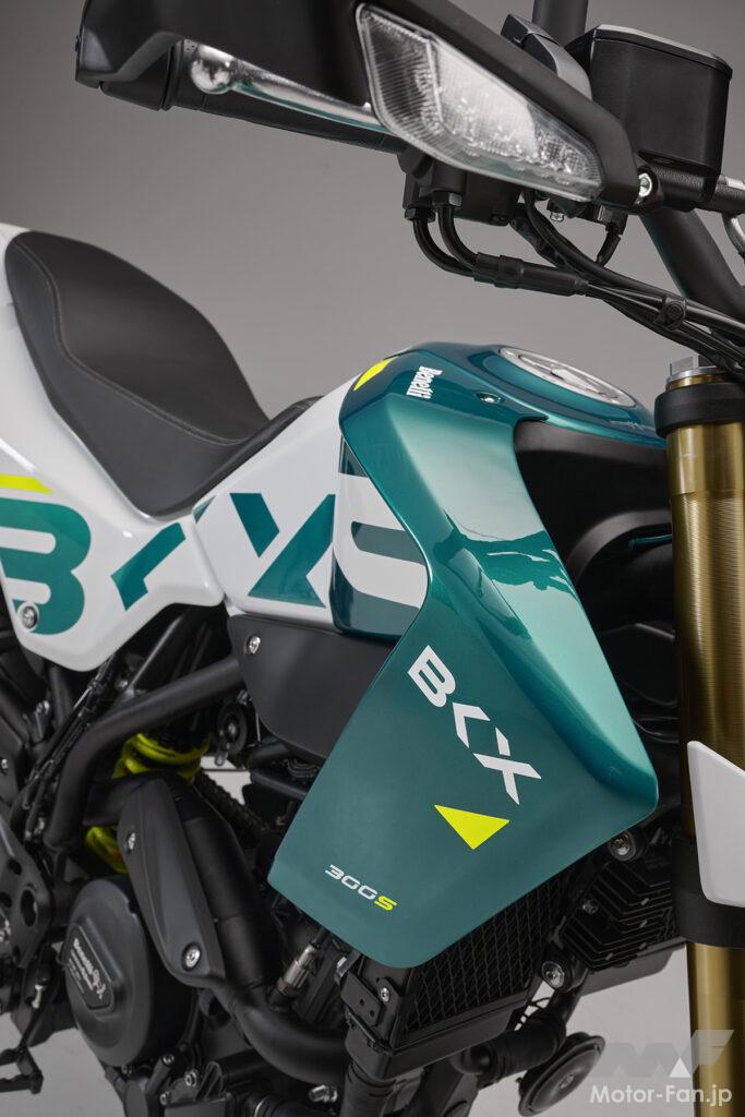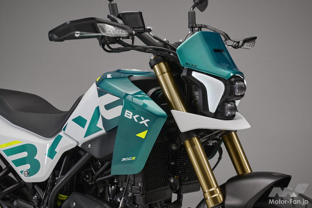 BKX300はタンクカバー一体型の大型フロントフェアリング、フロントウインカー一体型のブッシュガードなど、アドベンチャーモデルに相応しい外装類をコーディネイト。