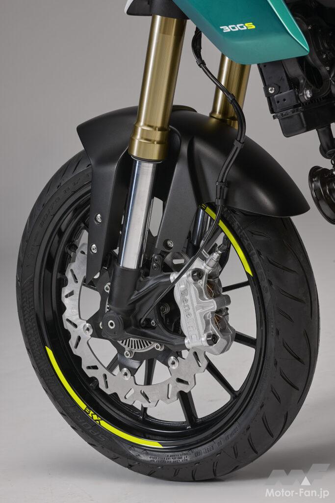 前後タイヤは舗装路に適したロードタイプとし、サイズはフロントに110mm幅の110/70-17、リアに150mm幅の150/60-17のワイドタイプをコーディネイト。