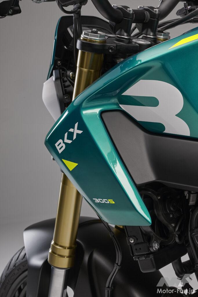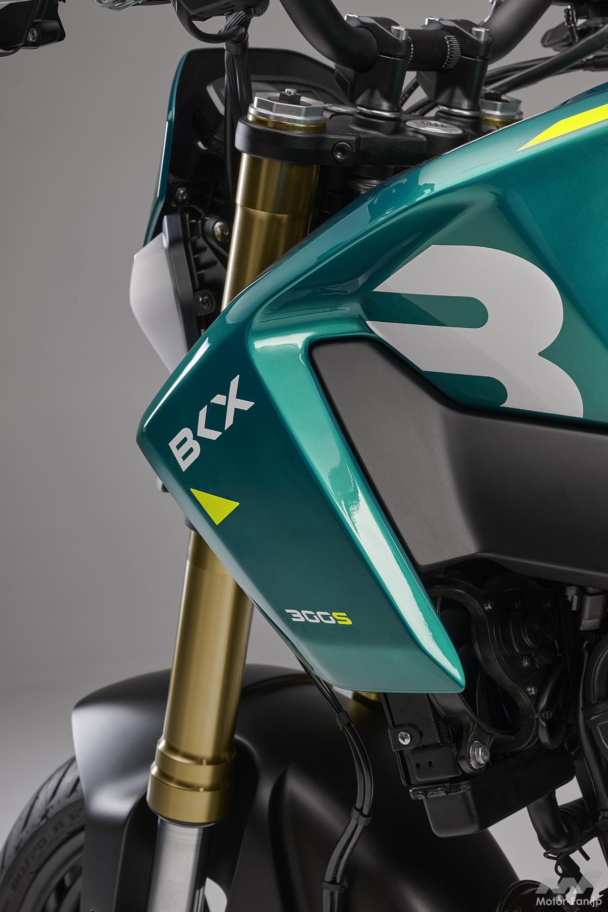 フロントサスペンションはプリロードと減衰の調整が可能な、倒立型のΦ41mmフロントフォークを採用。オンロード走行及びオフロード走行を想定したBKX300は180mm、オンロード走行のみを想定したBKX125Sは150mmのストローク量にセットアップ。