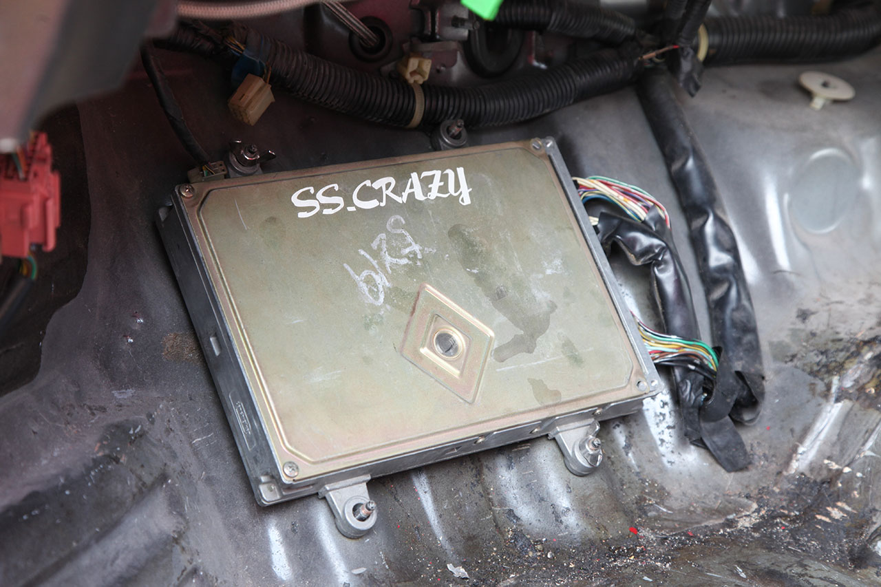 腰下はEF用でシリンダーヘッドがEG用のハイブリッド。制御はSSクレイジーECUが担当し、プロスタート改トラクションコントロール&ミスファイアリングも機能する。パワーは未計測だけど、EGのグループAマシンが公称235psだったから、余裕で200psを超えてることは確実。ブリッピングした時、何よりタコメーターの針の弾け方が尋常でなかった。