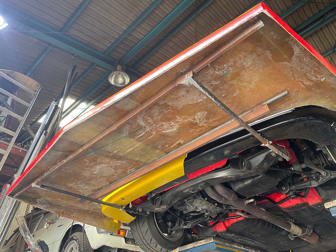 デッパ裏側の構造はこうなっていた!! まず、横方向に前後2本のスチール製角材を渡してデッパ本体の剛性を確保。肝心の位置決めは、フロントサブフレームから延ばされた左右のスチールパイプで行なう。