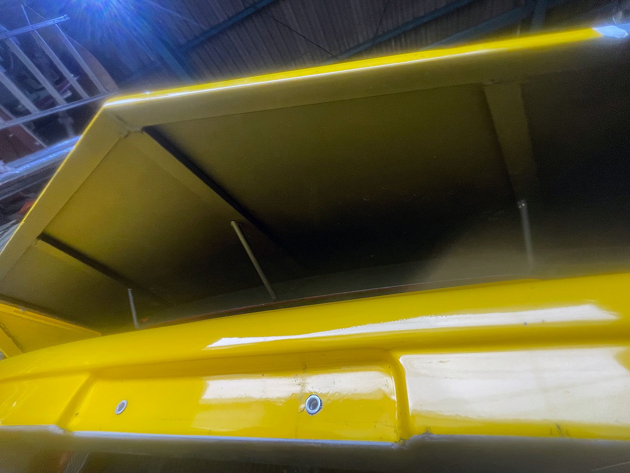 鉄板加工で継ぎ足されたボンネット前端部の裏側。中央と左右の角材で延長部分の強度を高め、それらと純正ボンネットの間に無垢材の丸棒を突っ張り棒のように溶接する。デッパもそうだけど、街道レーサー仕様ならではのノウハウがあるというわけだ。