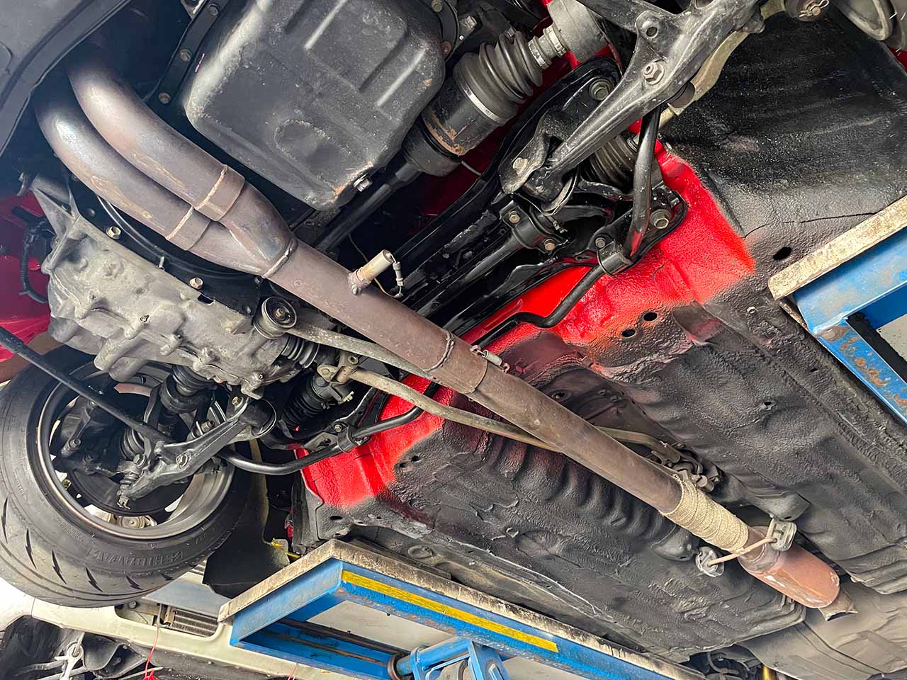 ちなみに、ミッションはこれまでレース用5速ドグMTを載せてたけど、高速巡航でエンジン回転数が上がりすぎて使い物にならないってことで純正5速MTに換装された。それでもタイヤ外径が小さく、ロ―ギヤード傾向が強いため、グループAマシンで使われたハイギヤードな富士スピードウェイ用3.2ファイナルを組むことで帳尻を合わせている。