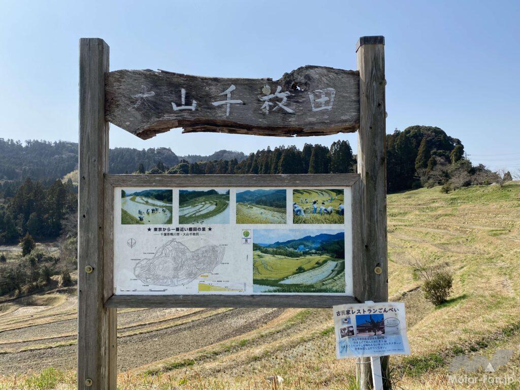 今回の目的地である鴨川大山千枚田は東京より一番近い棚田の里と知られ、3.2ヘクタールに階段状に並んだ375枚を数える棚田である。日本の原風景ともいえる素晴らしい田園風景が広がるこの地は「日本の棚田百選」にも登録される。
