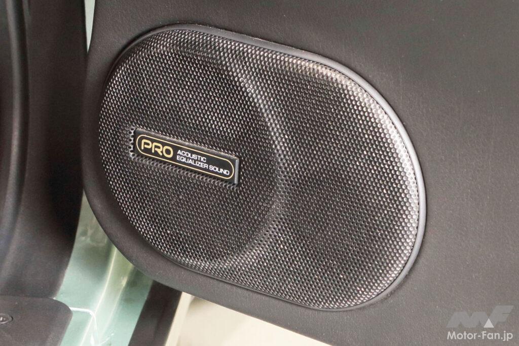 左右のドアスピーカーはただくっついているだけに見えるが、上方に20度、後方に15度傾けて設置されており、コンサート会場にいるかのような、前方定位の臨場感あふれる音場を実現するという。