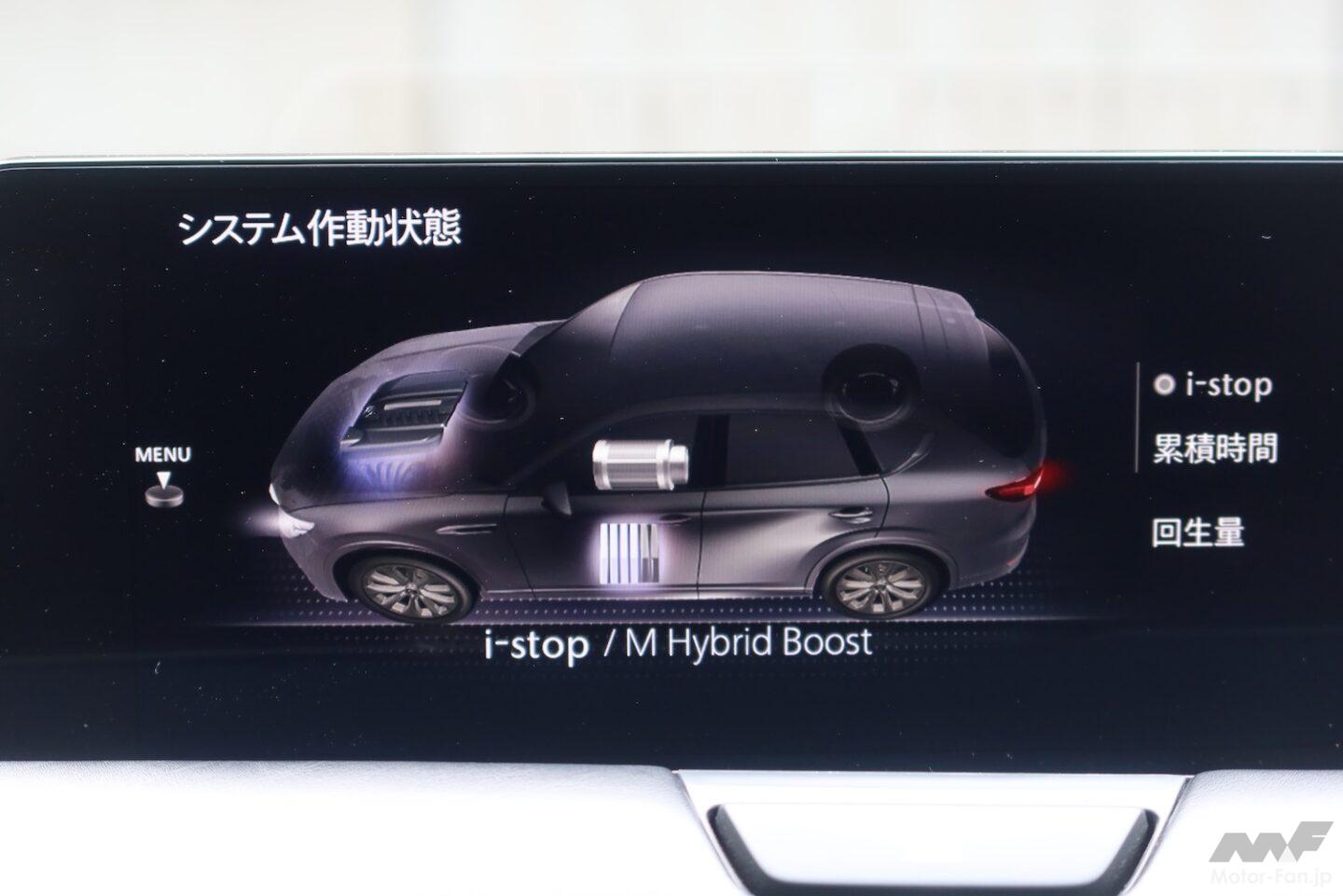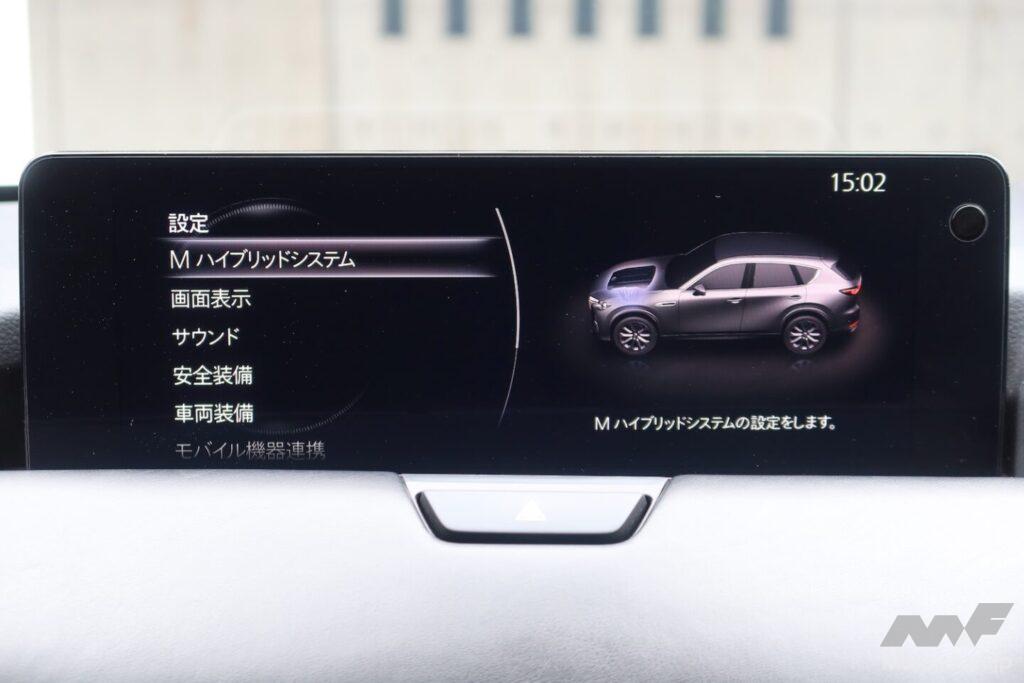 スターターモーターでのエンジン再始動は約40km/h以下の領域なので走行音は低く、スターター始動時に特有のキュルキュル音が耳に届きやすい。燃費が多少悪くなっても静かなハイブリッド用モーターでの再始動がいいという場合には、切り替えができる。12.3インチセンターディスプレイに設定画面を表示させると、一番上に「Mハイブリッドシステム」のメニューが表示される。これを選択すると、「走行中のエンジン静音始動」と表示されるのでコマンダースイッチを押下して□にチェックマークを入れればいい。その際、「モーターのアシストによりエンジンを静かに始動できますが、燃費を低下させる場合があります。設定を有効にしますか?」の確認画面が出る。チェックマークを入れて「有効」にすると、ハイブリッド用モーターで再始動するようになる。