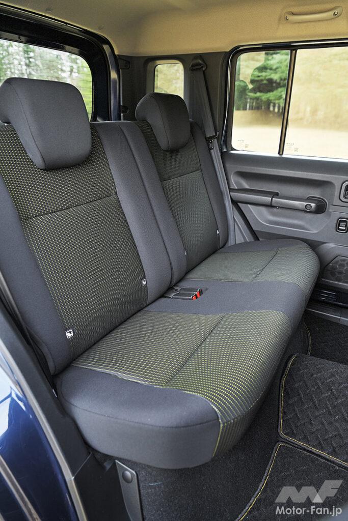 前席は腰の部分をしっかりと支えて、長距離を快適に移動できる。肩まわりのサポート性も良く、悪路で体が左右に振られても着座姿勢が乱れにくい。後席の座り心地も3ドアのジムニーに比べて大幅に快適だから、4名で長距離を移動する用途にも適する。