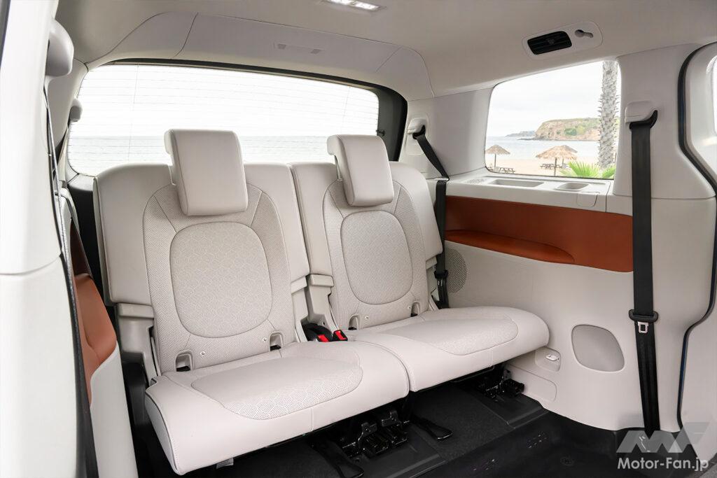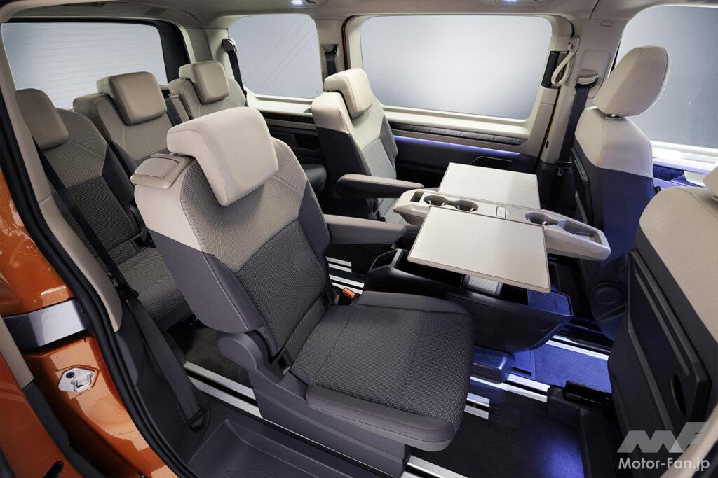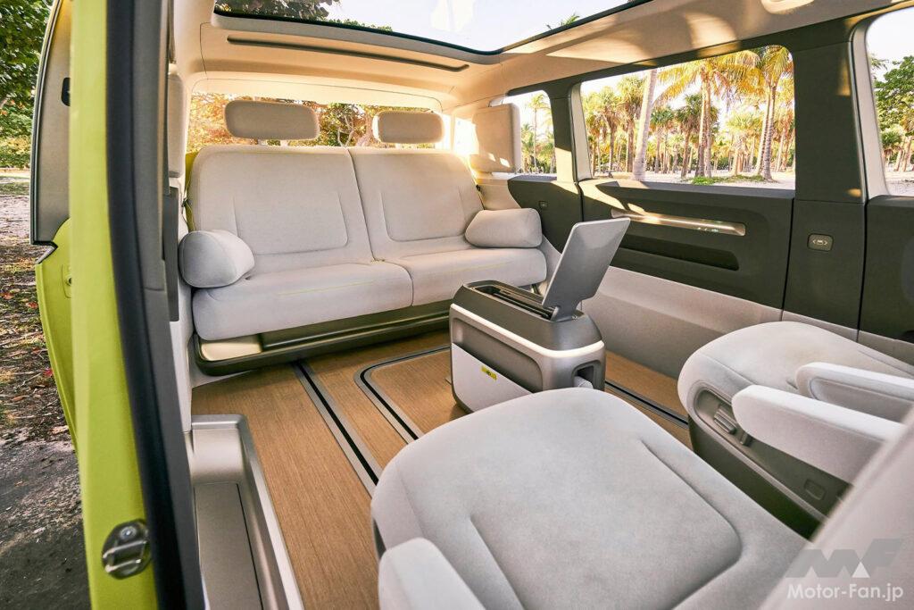 2列目席は180度回転させて3列目席と対座もでき、折り畳みテーブルを内蔵したセンターコンソールはフロント席から3列目乗員の前までロングスライドできるなど、ID. Buzzコンセプトのアイデアが具現化されている。生産型ID. Buzzにはない機能だけに、ファンにとっては気になるところだろう。