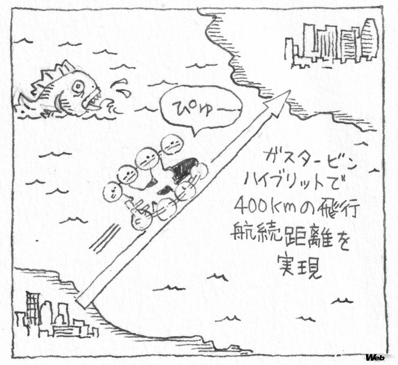 これは、ジェット旅客機にも用いられるガスタービンエンジンで発電機を駆動。ここで得た電力をモーターに供給し、ローターを回転させるもので、その最大のメリットは航続距離を400km程度まで拡大できることにある。ホンダの調査によれば、eVTOLの需要でもっとも期待されているのは最大400km程度の都市間移動であり、これをバッテリー駆動で実現するのは、今後20年間の技術開発を見込んでも困難であるという。