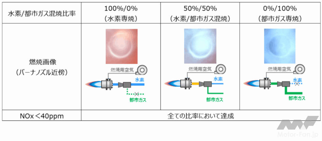 NOxは空気中の窒素と酸素が反応することで発生する。水素は都市ガスと比較して燃焼速度が速く、火炎内で局所的な高温部が発生するため、NOxが発生しやすいという特性があるが、今回開発された「水素/都市ガス兼用バーナ」により、急激な燃焼拡大を緩和し、NOx発生量を都市ガス専焼と同等の40 ppm未満に抑制することに成功した。また、燃焼用空気が過大になると排ガスの熱損失によるエネルギーロスが発生するが、水素、都市ガスそれぞれに対する空気の流量を「燃焼制御ユニット」と「燃焼制御盤」が精密にコントロールすることで、排ガスの熱損失を最小限とし、高効率運転かつ全燃焼領域での低NOxが実現された。NOx発生量抑制と高効率運転の実現にあたっては、混焼比率や冷暖房出力に応じた燃焼用空気量の精密な制御が必要。今回、全ての混焼比率・冷暖房出力の条件下において、NOx発生量、冷暖房効率について確認・改善が行われ、全条件下で技術的な課題をクリアし、安定運転が実現された。