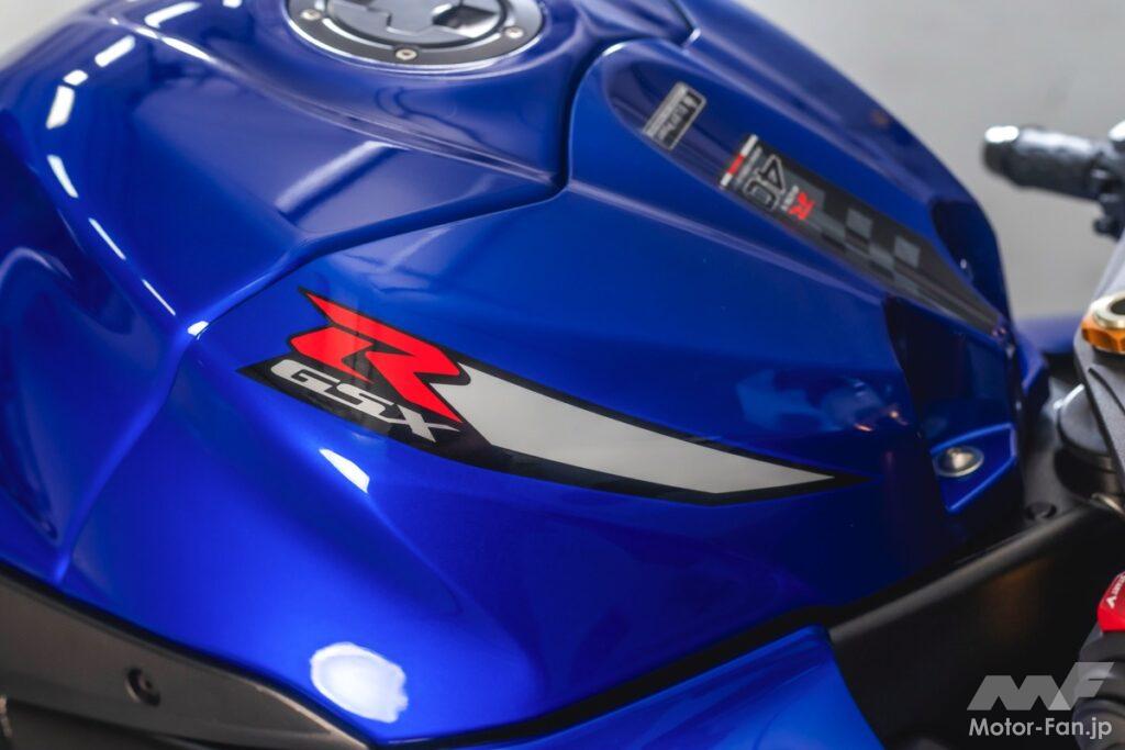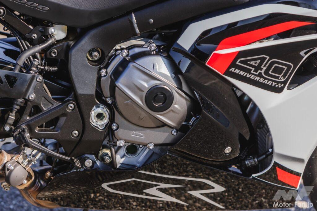 40周年モデルには、3色の特別カラーが設定された。Pearl Vigor Blue/Pearl Tech White、Candy Daring Red/Pearl Tech White、Pearl Ignite Yellow/Metallic Mat Stellar Blueのカラーリングは、GSX‑Rの歴代レーサーを彷彿とさせるものとなっている。サイドフェアリング、燃料タンク、マフラー、キーキャップなどに“40th anniversary”ロゴや専用デカールを施し、特別感を演出している。