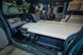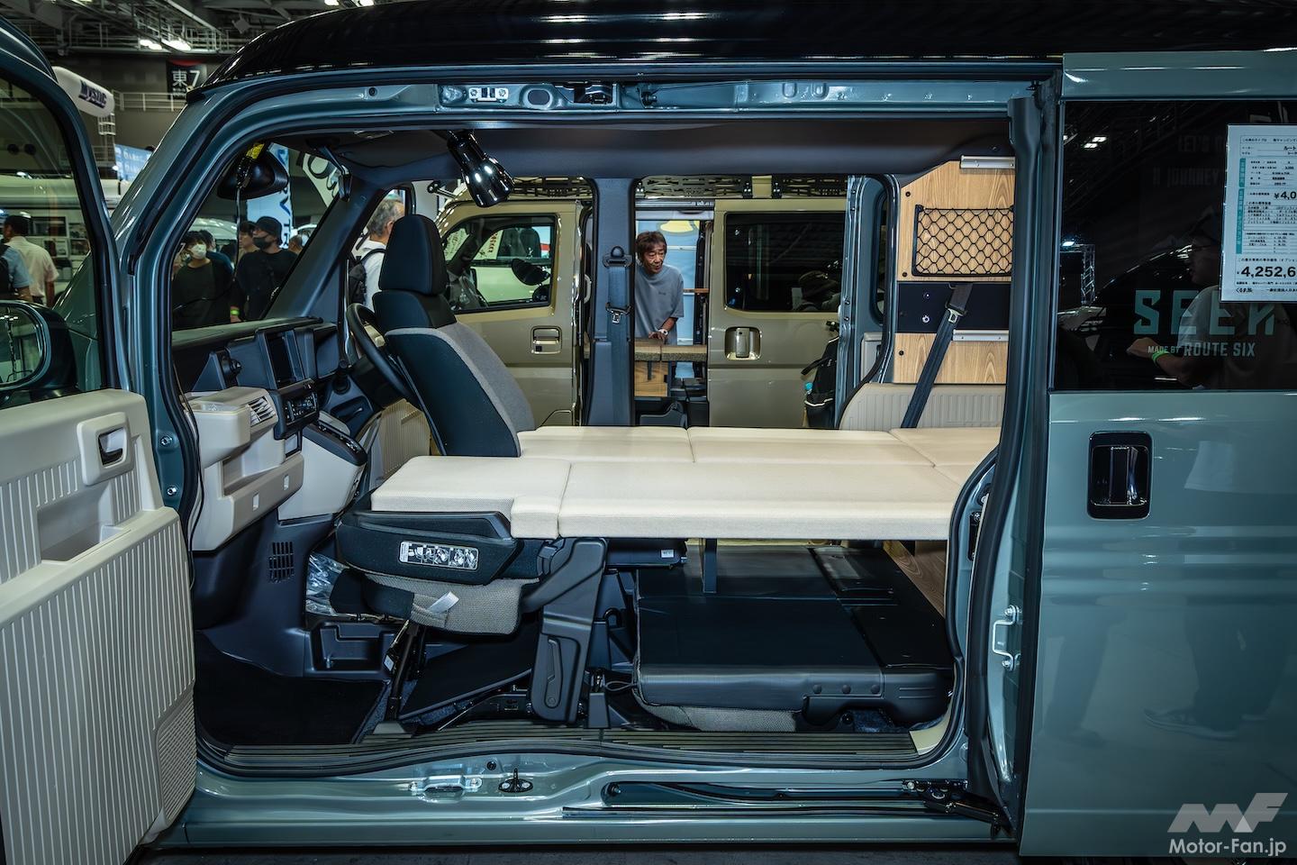 そんな弱点を解決したキャンパーのひとつが、ルートシックスの「シーク」だ。シークはまず、運転席の回転機構を付けた上で、シートを倒した空間にベッドマットを展開。これで大人2名の就寝を可能にしたのである。さらに車内後部にホワイトウッド調の家具をインストールして、収納とテーブルの機能を付加している。