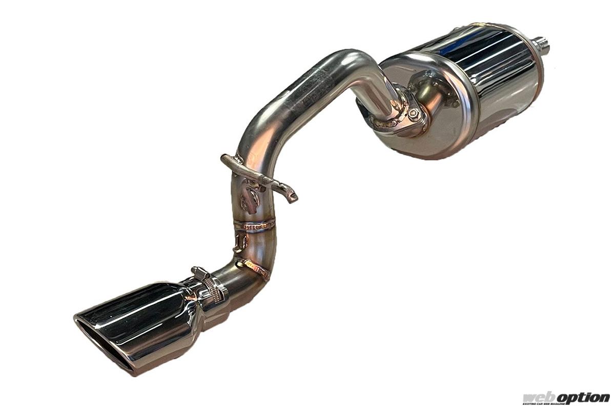 この製品は4WDターボモデル用で、純正マフラーのリヤピース部分をカットして取り付けるタイプ。50φのフルストレート構造を持ち、車検対応ながら優れた排気効率とサウンドを実現してくれる。近接排気騒音は純正の73dBに対して、76dBとなる。