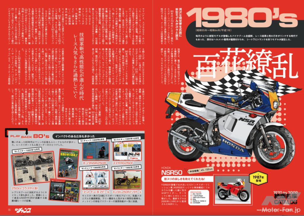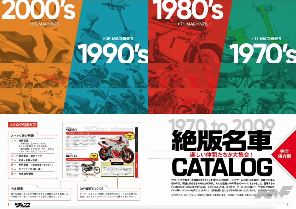 株式会社三栄が発行する『月刊モトチャンプ』2025年9月号が8月6日に発売される。特集は「あの時代、あの熱狂が蘇る!50cc〜250cc 絶版名車カタログ」。1970年代から2000年代までのソフトバイクやブーム期の名機を、約160台にわたるカタログ形式で振り返る内容だ。かつてのオーナーである二輪ジャーナリストや本誌ライターのエピソードも収録され、懐かしさと共に、国産ミニバイクファンにはたまらない一冊となる。定価は770円。メーカーごと・年代ごとに違えど熱狂に共通する魅力を余すところなく紹介している。