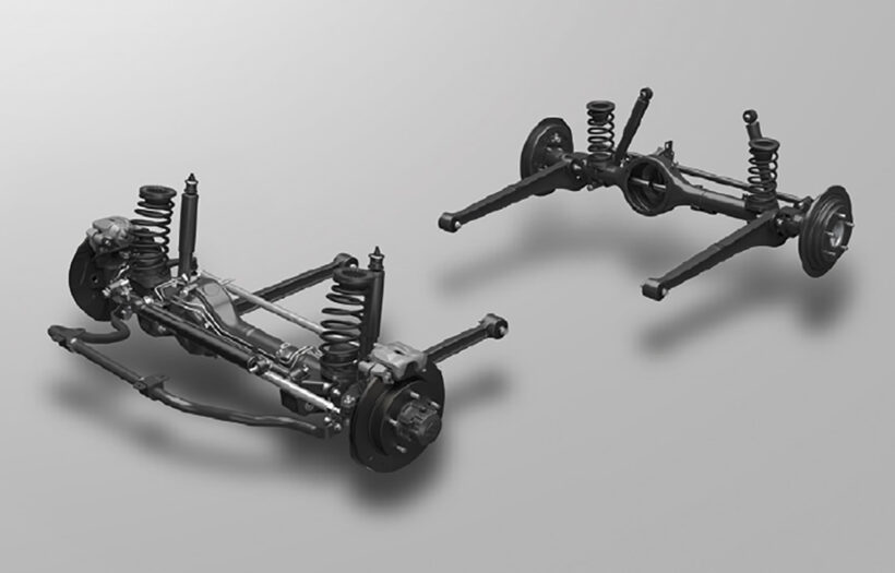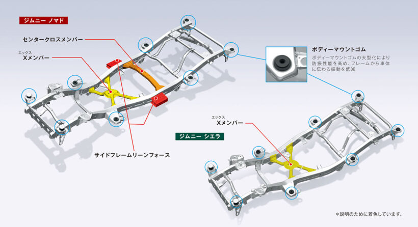 新車レビュー 【ジムニーノマド探究/足まわり】悪路をガンガン走れる秘訣は、路面に対して常に駆動力を伝達する特殊設計だった!【写真・2枚目】 乗用車のフロントサスペンションはストラットなどの独立式が主流だが、ノマドを含めたジムニーシリーズは、耐久性の優れたリジッドタイプ、つまり車軸式を採用している。 車軸式サスペンションにより、デコボコの激しい場所でもタイヤを路面に接地させ、しかも路面とシャシーの間隔も十分に確保できる。悪路に最適なサスペンションを開発した。 ローレンジに入れると、すべてのギヤについて、速度に対してエンジン回転数が高まる。駆動力が増強され、悪路の走破力を向上できる。悪路向けのSUVには必須のメカニズムだ。 副変速機の切り替えレバーは、サイドブレーキレバーの右側に装着されている。前方から2WDのハイレンジ/4WDのハイレンジ/4WDのローレンジにシフトできる。 ジムニーノマドでは、前輪のディスクブレーキがベンチレーテッドタイプになる。2枚のディスクを重ねた形状で、その間に空気が通るため、放熱効果が優れている。 ジムニーシリーズでは、梯子(ラダー)のような形をした耐久性の高いフレームに、ボディ、エンジン、サスペンションなどを架装している。ラダーフレームの中央付近には、Xメンバーも装着されてボディ剛性を高め、捩れが生じにくい構造としている。 車軸式サスペンションは耐久性が高く、なおかつ設計の仕方によっては、デコボコの激しい悪路でもタイヤの路面接地性を十分に確保できる。駆動輪の空転を抑えられる。 この画像の記事を読む