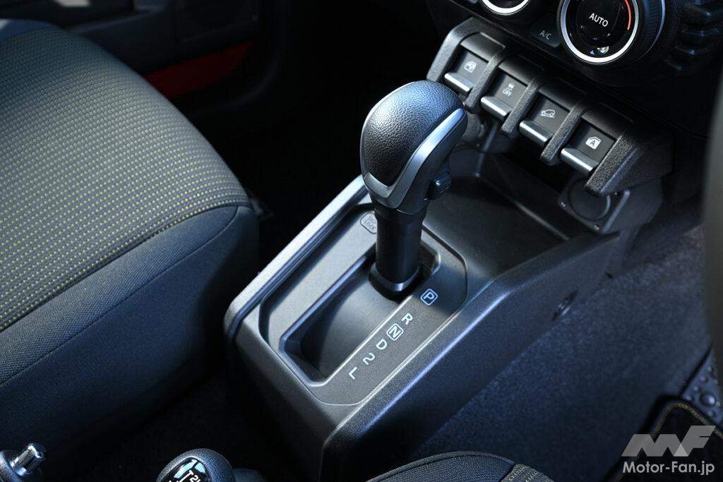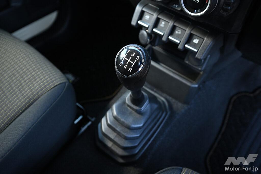 トランスミッションは4速ATと5速MTが用意され、運転を積極的に楽しみたいなら後者を選ぶと良い。今はハイブリッドが増えた影響もあり、マニュアルトランスミッションを設定している車種が大幅に減った。特にSUVになると、ボディサイズを問わず、マニュアルトランスミッションはほとんど選べない。ジムニーノマドの5速MT仕様で、副変速機をローモードにシフトして悪路に乗り入れると、テクニックを生かした走りを満喫できる。