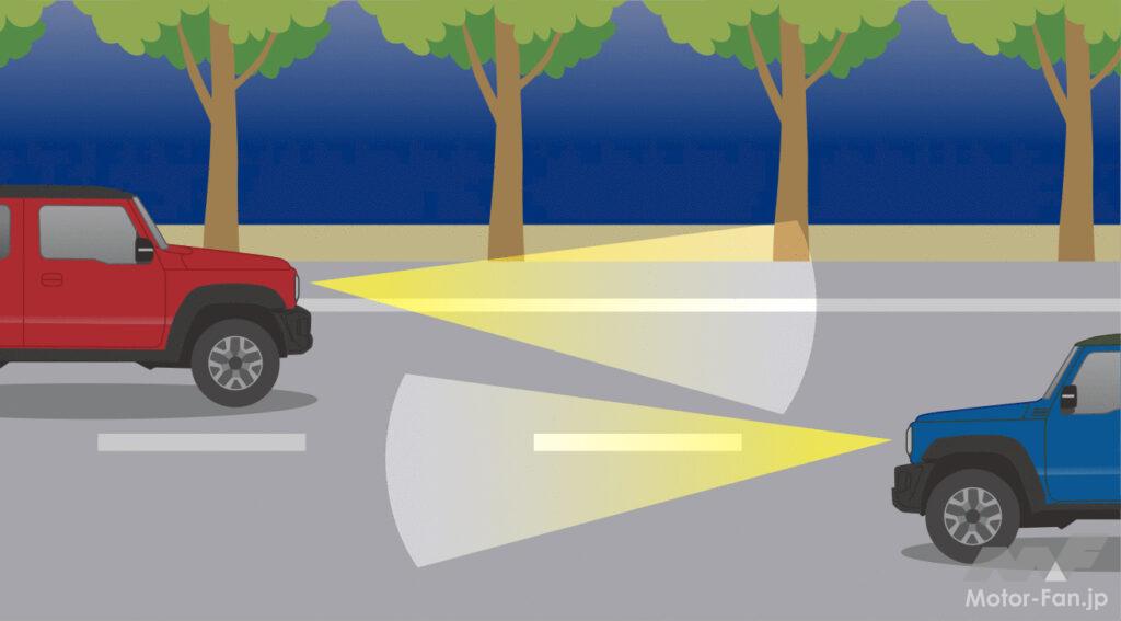 ハイビームで走行中に、対向車や先行車を検知すると、自動的にロービームに切り替える。対向車や先行車がいなくなると、自動的にハイビームに戻る。