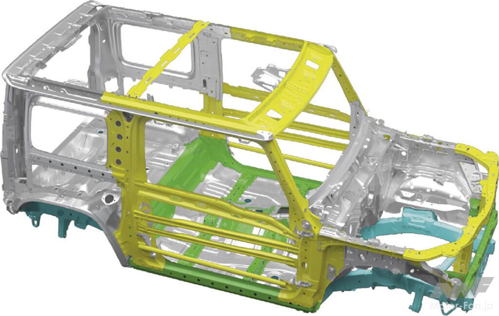 ジムニーシリーズは、一般的な乗用車のモノコック構造ではなく、ラダーフレームにボディを架装している。そのために専用の衝撃吸収ボディを採用して、安全性を向上させた。