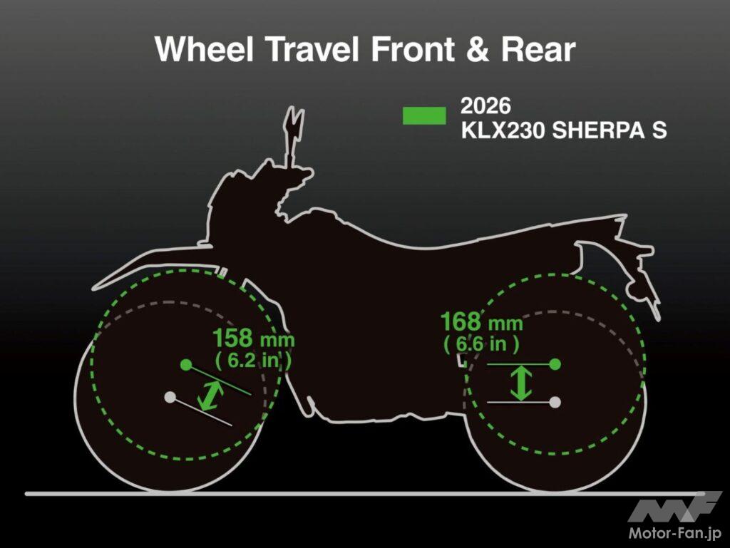前後サスペンションにはKLX230 SHERPA S専用のデュアルレートスプリングを採用。ホイールトラベル量はフロント158mm、リヤ168mmに設定され、従来モデルのフロント200mm、リヤ223mmから変更されている。この調整により、オンロードでの快適性とオフロードでの走破性のバランスを最適化した。