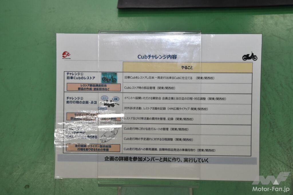 第二弾はスーパーカブによる日本一周「Cubチャレンジ」。不動車のスーパーカブC100(1958年)とC105(1961年)をレストアし、日本を一周してホンダ学園50周年式典の会場を目指すというもの。Cubチャレンジは関東校2台、関西校2台の4台で行われ、関東校がC100を2台、関西校がC100とC105を担当している。