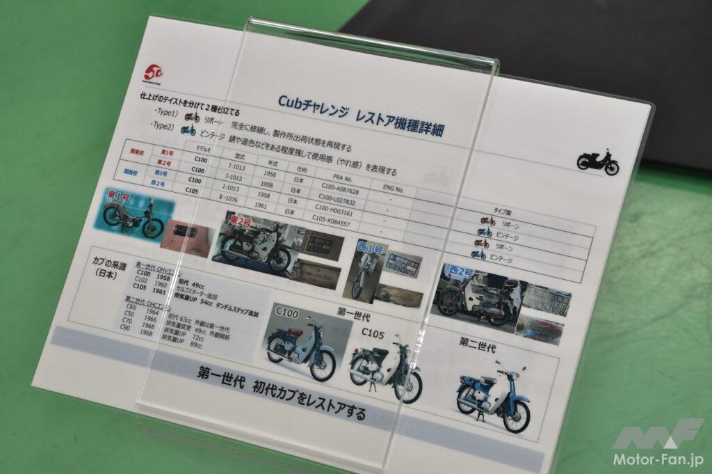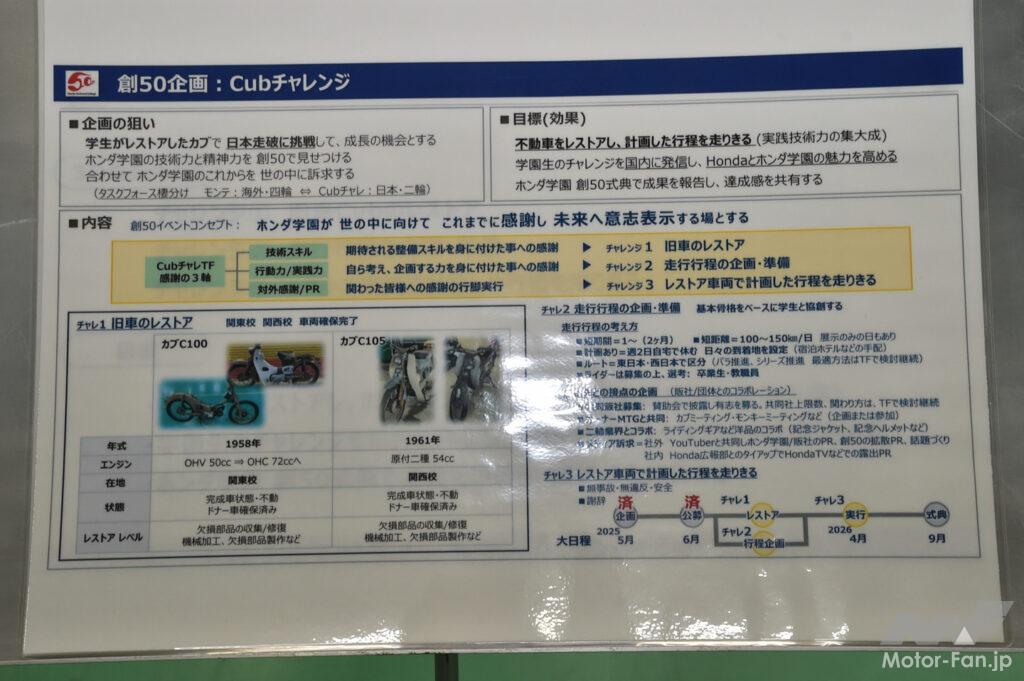 第二弾はスーパーカブによる日本一周「Cubチャレンジ」。不動車のスーパーカブC100(1958年)とC105(1961年)をレストアし、日本を一周してホンダ学園50周年式典の会場を目指すというもの。Cubチャレンジは関東校2台、関西校2台の4台で行われ、関東校がC100を2台、関西校がC100とC105を担当している。