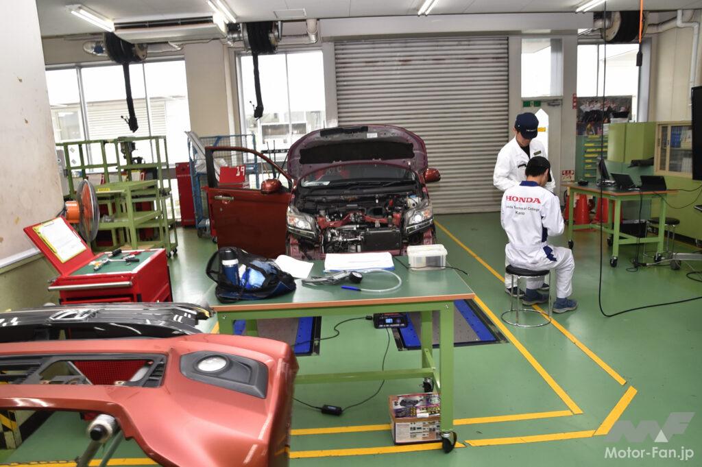 一方、自動車整備の部門ではホンダが提供する最新モデルを中心に、自動車整備を学ぶ。基本的には新車状態のクルマで行なうのだが、整備の現場では様々なコンディションのクルマを扱うことになるた、古めのクルマや中古車を教材として用意することもある。