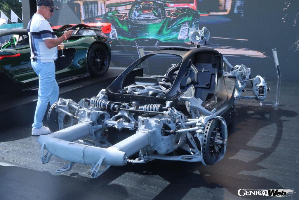 パワートレインも独創的だ。「排気量2.88リッターV8ツインターボエンジンは私たちの会社で開発し、生産されるもので、クランクシャフトはフラットプレーンを用いています。そのクランクシャフトにはギア駆動で発電機が接続されている(これとは別に後輪をメカニカルに駆動する)ほか、フロントには左右輪を個別に駆動するモーターを搭載。これらに電力を供給する高性能バッテリーもフロントにふたつ搭載しています。いずれも小型軽量でエネルギー密度は高く、セルにはF1の技術を用いています。このふたつのモーターでトルクベクタリングを実現しました」