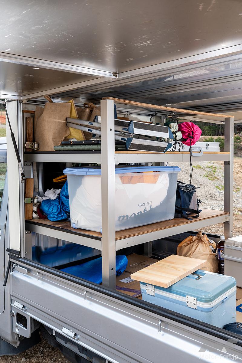 オフ会 軽トラの使い方が大きく変わる! カーゴボックス『Lanps』の機能性にベタ惚れです!!【写真・2枚目】 OWNER 向出育生さん(石川県)金沢から奥さまの美和さんと駆け付けてくれた向出さんはLanpsの機能性にベタ惚れ。これからも長い付き合いが続きそう。 Lanpsの設計思想を踏まえて向出さん自ら製作したアルミ製3段ラックは2つにセパレートすることも可能。 屋根上スペースも最大限に有効活用すべくLanps専用のルーフラックも製作。長尺物も余裕を持って積載できるよう配慮されている。 DAIHATSU S500P HIJET 扉を3方向に開閉できるため、アルミ缶の収集現場でもフレキシブルに対応。走行時に内容物が見えないのもポイントになっている。 OWNER KAN-KANさん(岐阜県)本職は大工ながら父親の意志を継ぐカタチで空き缶収集にも精を出すKAN-KANさん。ミドボン情報ありがとうございます!! この画像の記事を読む