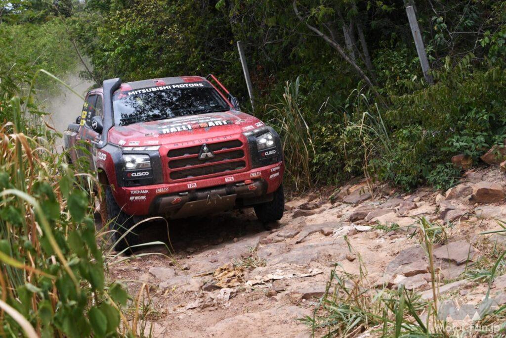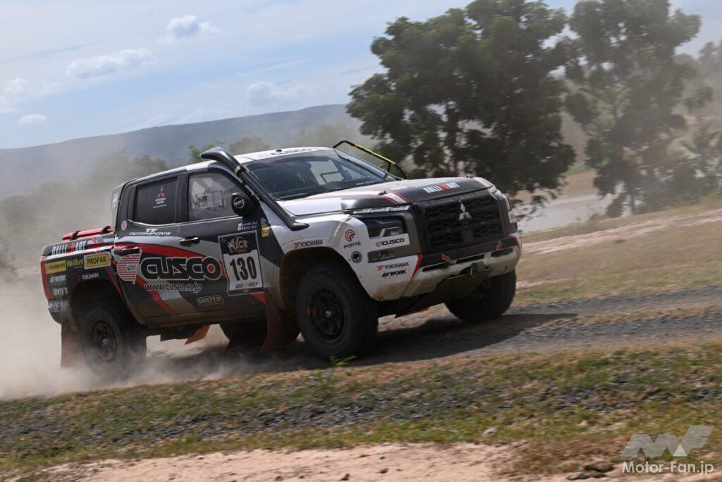 その6秒後に入ったのが「No.112 MITSUBISHI RALLIART」のChayapon Yotha/Peerapong Sombutwong組(三菱トライトン/3時間37分10秒)。初日から2番手、2番手、3番手と好調さをキープし、ここで2位に11分もの差をつけ暫定総合1位に上がることとなった。