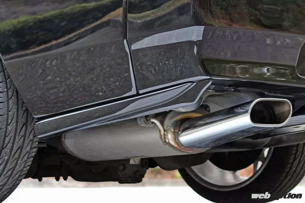 マフラーはスーパースプリント製VWゴルフIII用を加工流用する。選択の理由は、「メインサイレンサーに対してオーバル形状のテールエンドが下にオフセットしていること。「そうすれば、リヤバンパーの切り欠き部をスムージングできますからね」とオーナー。