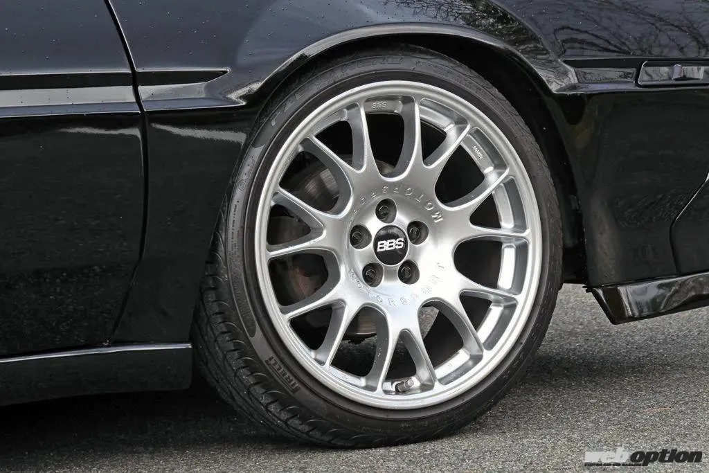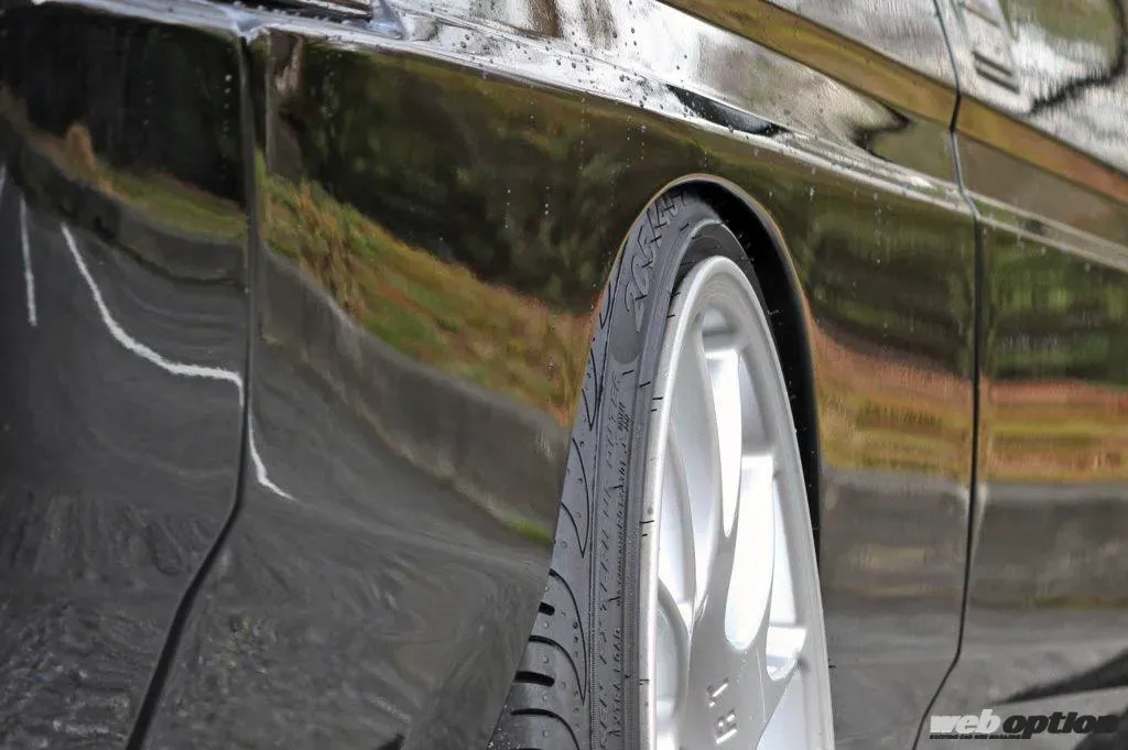 仕上げは足元を飾るBBS RHホイールと、フェンダークリアランスに拘った車高だ。ホイールサイズは前後8.5J×17インセット35で、205/40R17サイズのピレリPゼロネロを気持ち引っぱり気味に履く。これを、ロングハブボルトに打ち替え、ハブリング付き12mmスペーサーを介して装着。ネガティブキャンバー角と合わせて絶妙なフェンダークリアランスを見せる。