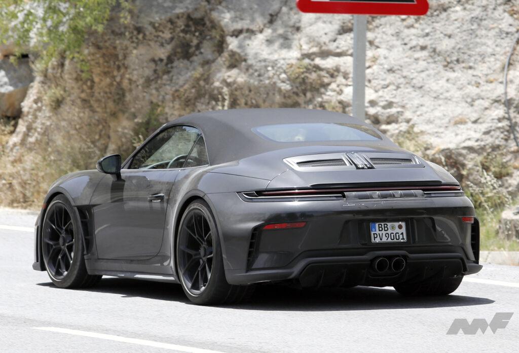 そしてついに、スペインのスクープ班は、GT3ボディをベースにしながらもクラシックなコンバーチブルレイアウトを採用した、次世代911スピードスターの姿を捉えることに成功した。
