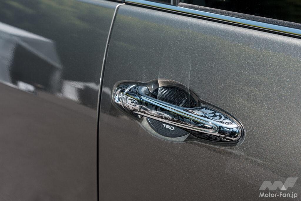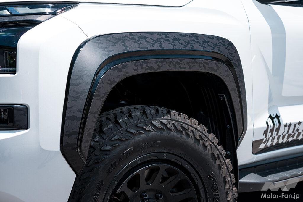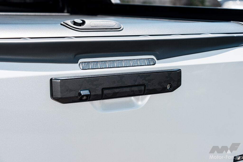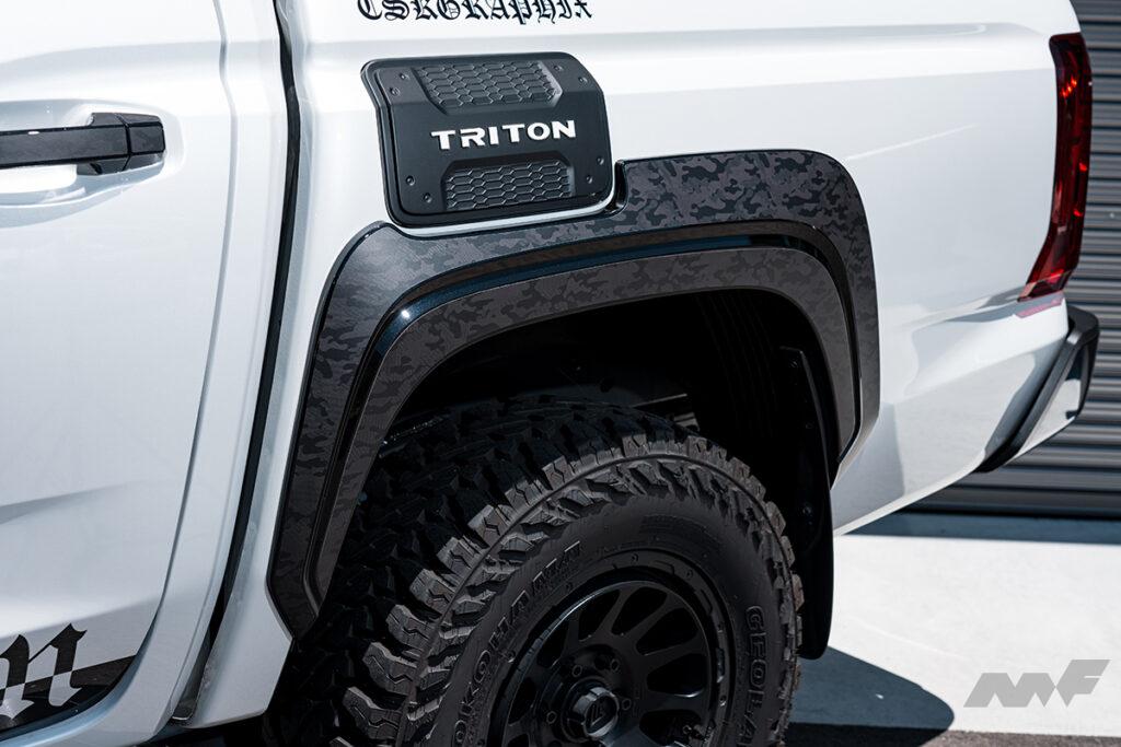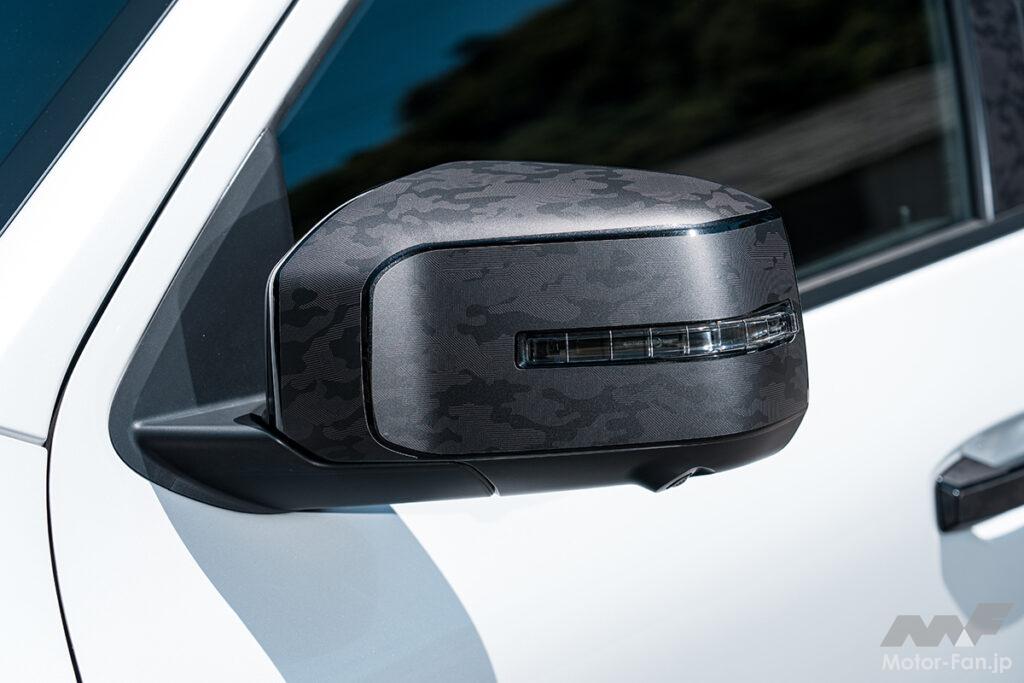 またハイラックスでは、純正メッキが活きる彫刻のような「エングレーピング」を採用しているが、トライトンは純正樹脂部分が中心のため、それを活かした「カモフラージュ」デザインを採用しているのもポイント。タフな印象を底上げできるコーディネイトになっている。