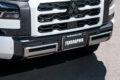 ハイラックスでは、特徴的な大型グリルの枠をメインとした純正メッキ部を設定していたが、トライトンは、ヘッドライトを囲うコの字型パネル部分、フロントバンパーのアンダー部をアレンジ。さらに純正オーバーフェンダー、そしてリアカーゴ上部のパネル部分を設定し、スポット的な施工ながらも変わった感を大きく味わえるプログラムを提案している。もちろんドアノブやリアゲートノブ、ピラーなどの定番部分のアイテムもしっかりと網羅している。