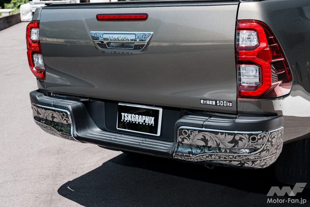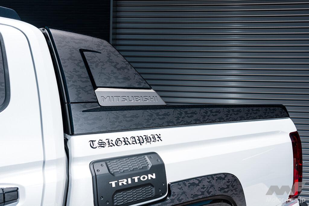 またハイラックスでは、純正メッキが活きる彫刻のような「エングレーピング」を採用しているが、トライトンは純正樹脂部分が中心のため、それを活かした「カモフラージュ」デザインを採用しているのもポイント。タフな印象を底上げできるコーディネイトになっている。