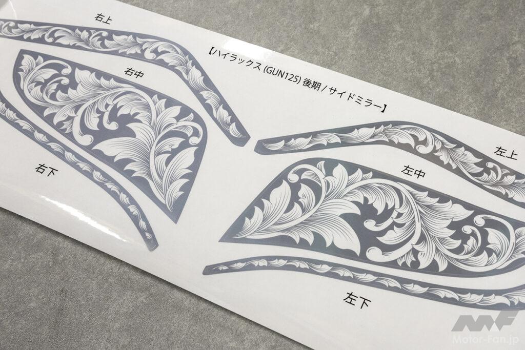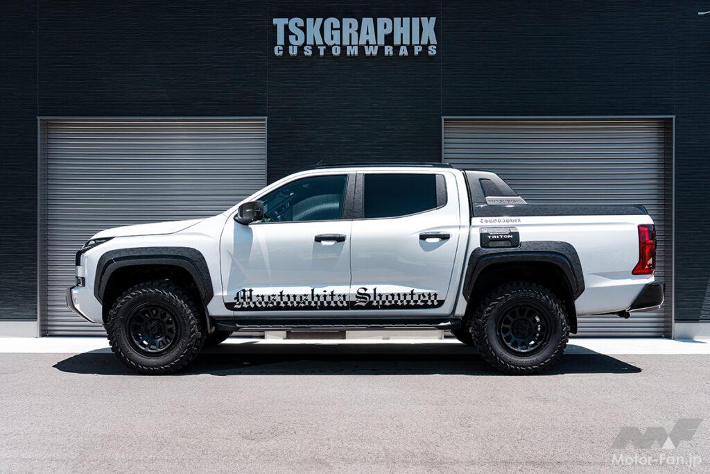 クルマの印象をイッキに変えることができるオールペンやラッピング。しかし価格的に少し敷居が高い感じもある。TSKグラフィックスでは、クルマ全体ではなく、部分的にアレンジが可能なカット済みの「プレカットデカール」を設定。これは、純正ボディカラーを活かしながらも、アクセントをプラスできるアイテム。すでに発売中のハイラックス用に加えて、今度はトライトン用も新発売したのでデモカーをチェック。