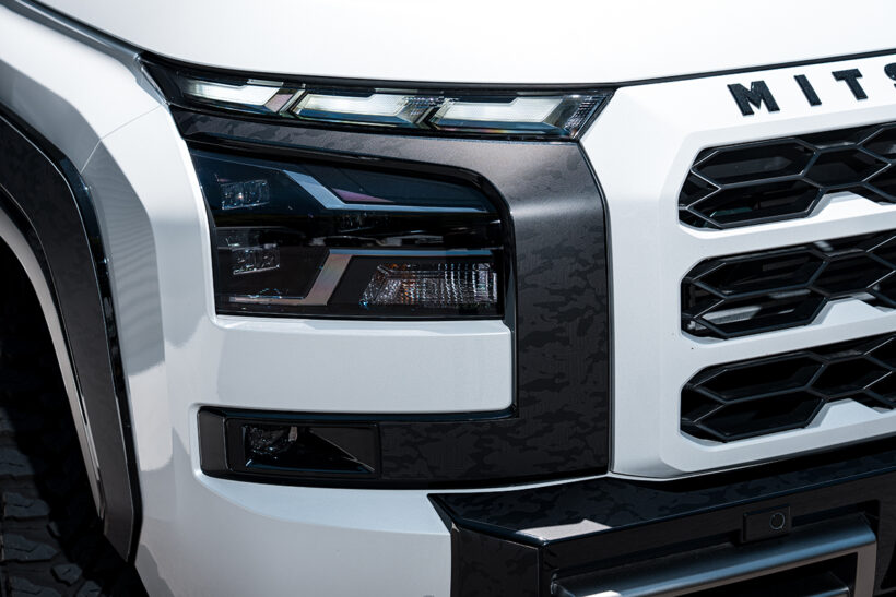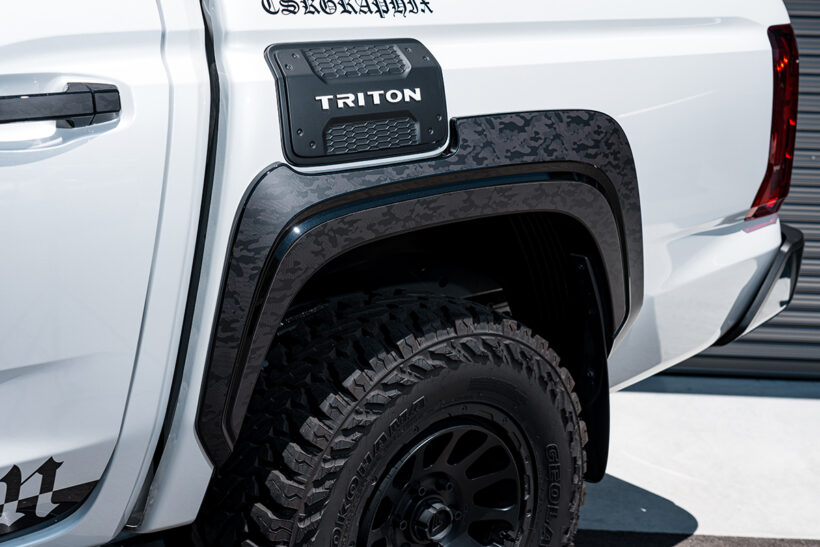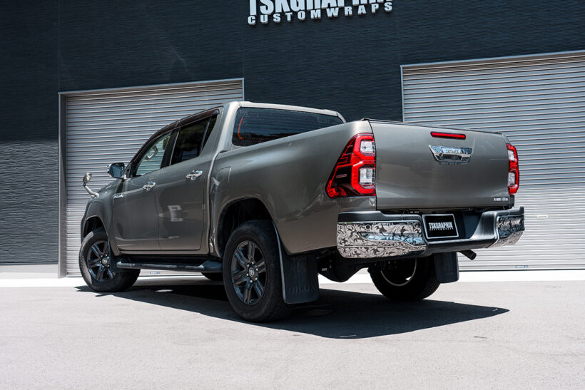 DIY・メンテナンス 樹脂パネルを「カモフラ柄」にチェンジ! 『三菱トライトン』専用のプレカットデカールは、DIYで手軽に楽しめる!【写真・19枚目】 リアカーゴサイドのパネル部分も面積が大きくて、装着効果が非常に高いポイント。オバフェンと合わせて施工することで、サイドビューのアピール度は大きく向上。ハイエンドピックアップのイメージを大きく高めてくれる。 TSK GRAPHIX 三菱・TRITON タフネス感のあるフロントバンパー下部の純正黒部分に貼るフィルムも設定。ヘッドライトガーニッシュからの繋がりも良くフェイスまわりをスタイルアップ。 トライトンGSR用「プレカットデカール」 グラフィックフィルム(カモフラージュ) ハイラックスに用意されているプレカットデカールは、純正メッキ部分に貼るものを中心に設定。純正メッキに彫刻を施したように見えるエングレービングのデザインで高級感を底上げする。 リアスタイルもメッキバンパーやリアゲートハンドル部分にデカールを貼って、人とは違うオリジナル性をアピールする。 ハイラックスのアイデンティティでもある大きな開口部のグリル。その枠のメッキ部分をデカールでアレンジ。フェイスの印象がガラッと変わる。 純正メッキリアバンパーもエングレービングデザインでカスタムペイントしたかのようなスタイリングを実現している。 この画像の記事を読む