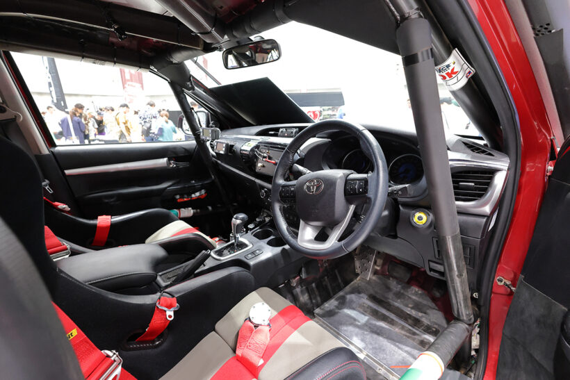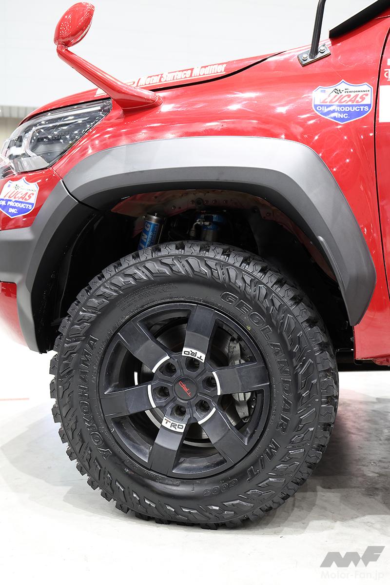エアロパーツ TRDの新『ハイラックス』は全幅2020mm!? 豪州製「Hilux Rouge」がめっちゃ気になる!!【写真・4枚目】 分厚くなったフェンダーは、正面から見ても迫力が満点だ。全幅は2020mmで、GRスポーツの車幅1900mmと比べても圧倒的。豪州純正パーツで、コレ、気になる人も多いのでは? TRD HILUX ワイドトレッドキットforハイラックス ・フロントサスペンション(ワイドトレッドアーム、ドライブシャフト等) ・リア専用スペーサー ・オーバーフェンダー、フロントバンパー(Rogue純正品) オーストラリア仕様の『Hilux Rouge』のキットを導入し、内装まで総合的に作り上げたラリー仕様。 この画像の記事を読む
