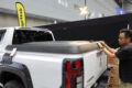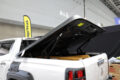 デモカーに便利度MAXのトノカバーを追加してきたのだ。このトノカバー、前側は電動、後ろ側は手動と、使い勝手に合わせて開閉手法を使い分けている。後ろからは手動なので手早く開閉でき、前側は電動で水平まで上がるので、どこに積んだ荷物へのアクセス性も◎というワケ。