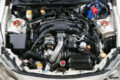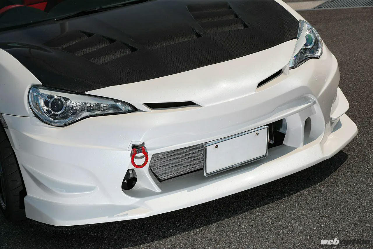 幾度かクラッシュも経験しているため、修理時にはLEDヘッドライトやエアロパーツを投入してアップデート。ところどころ潰れたインタークーラーのフィンを見れば、熱心な走り込みが伝わってくる。