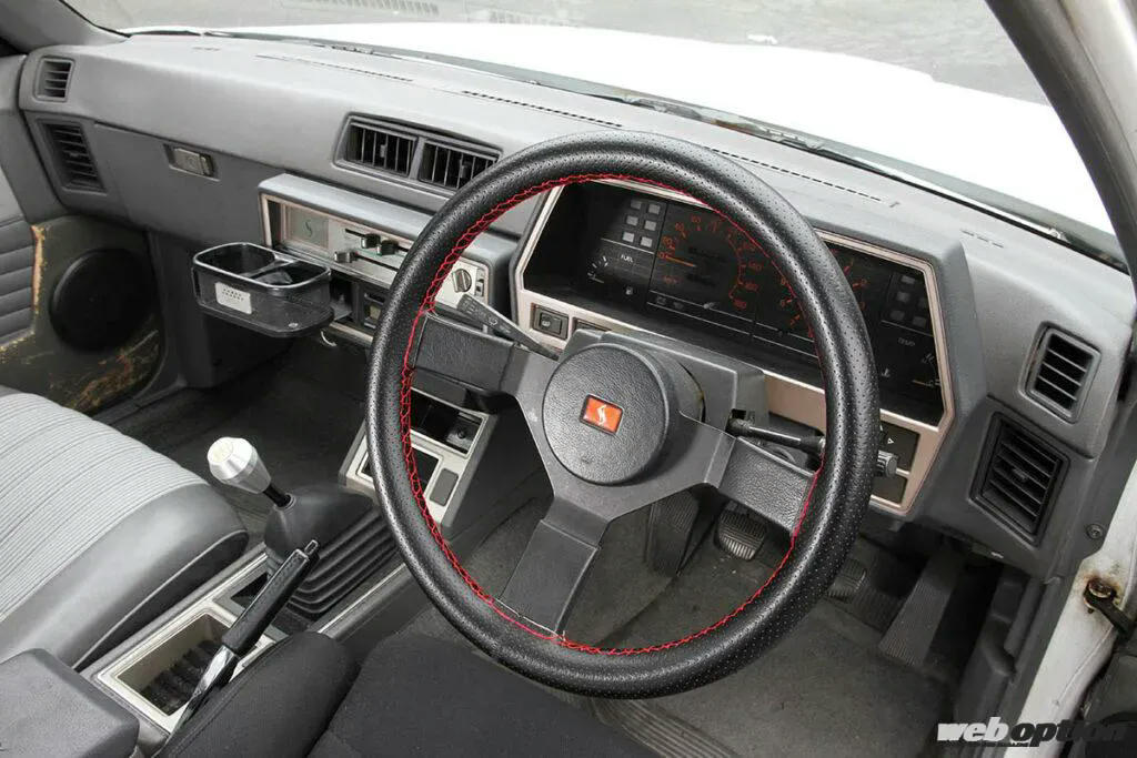ステアリングホイールはRS系の純正品に交換。タコメーターの代わりに大型アナログ式時計を装備するのがたまらない。1980年代の商用モデルや廉価グレードによく見られた手法だ。
