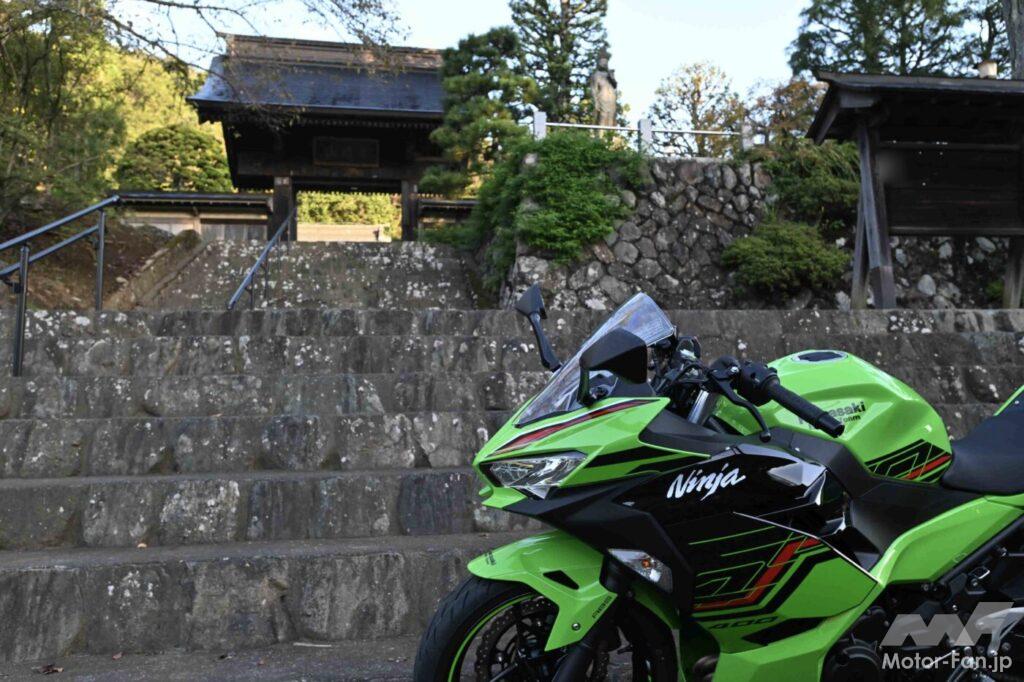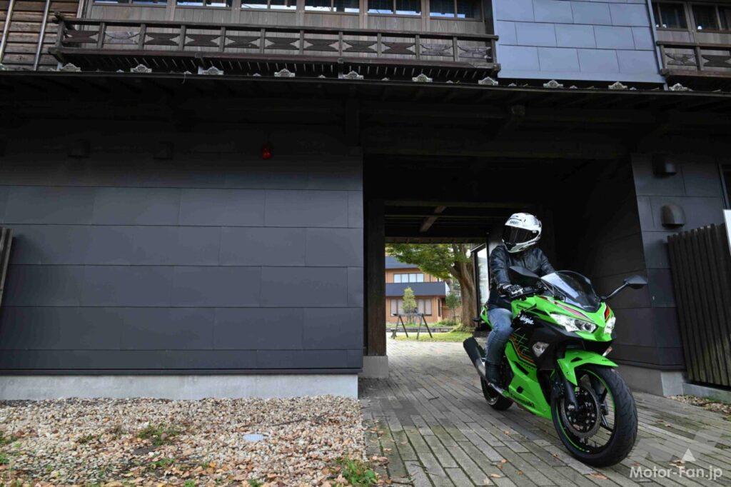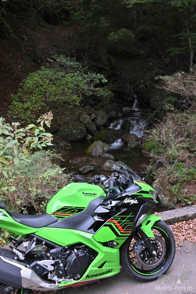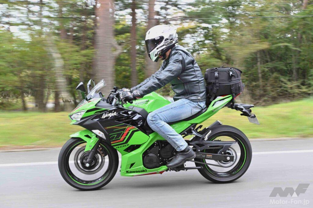 当記事の撮影兼ツーリングで久しぶりにニンジャ400を走らせた僕は、このバイクに好感を抱いた理由のひとつが、エンジンだったことを即座に認識。4スト400cc並列2気筒と言ったら、低中回転域からトルクフルで実直という印象を抱く人が多い気がするけれど(事実、CBR400RとYZF-R3はそういう特性で、4スト単気筒のRC390も味気は希薄だと思う)、ニンジャ400のエンジンは抑揚に富んでいて、低回転域では適度なドコドコ感、中~高回転域では左右気筒が力を合わせて駆け上っていくかのような爽快感が味わえるのだ。