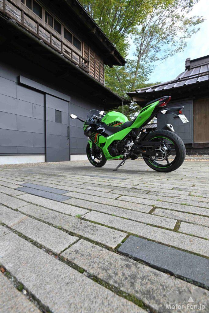まあでも、近年の250ccフルカウルスポーツが自分にとって理想的なのかと言うと、必ずしもそうではない。何と言ってもTZR250の最高出力・装備重量が45ps・142kg、パワーウェイトレシオが3.15ps/kgだったのに対して、現代の250ccクラスで最も運動性能に優れるホンダCBR250RRは42ps・168kg・4ps/kgなのだから。そんなわけで、もう少しのパワーともう少しの軽さが実感できる現行車を探していた僕が、数年前の初試乗時に“コレだ‼”と感じたのが、48ps・167kg・3.48ps/kgの現行ニンジャ400なのである。