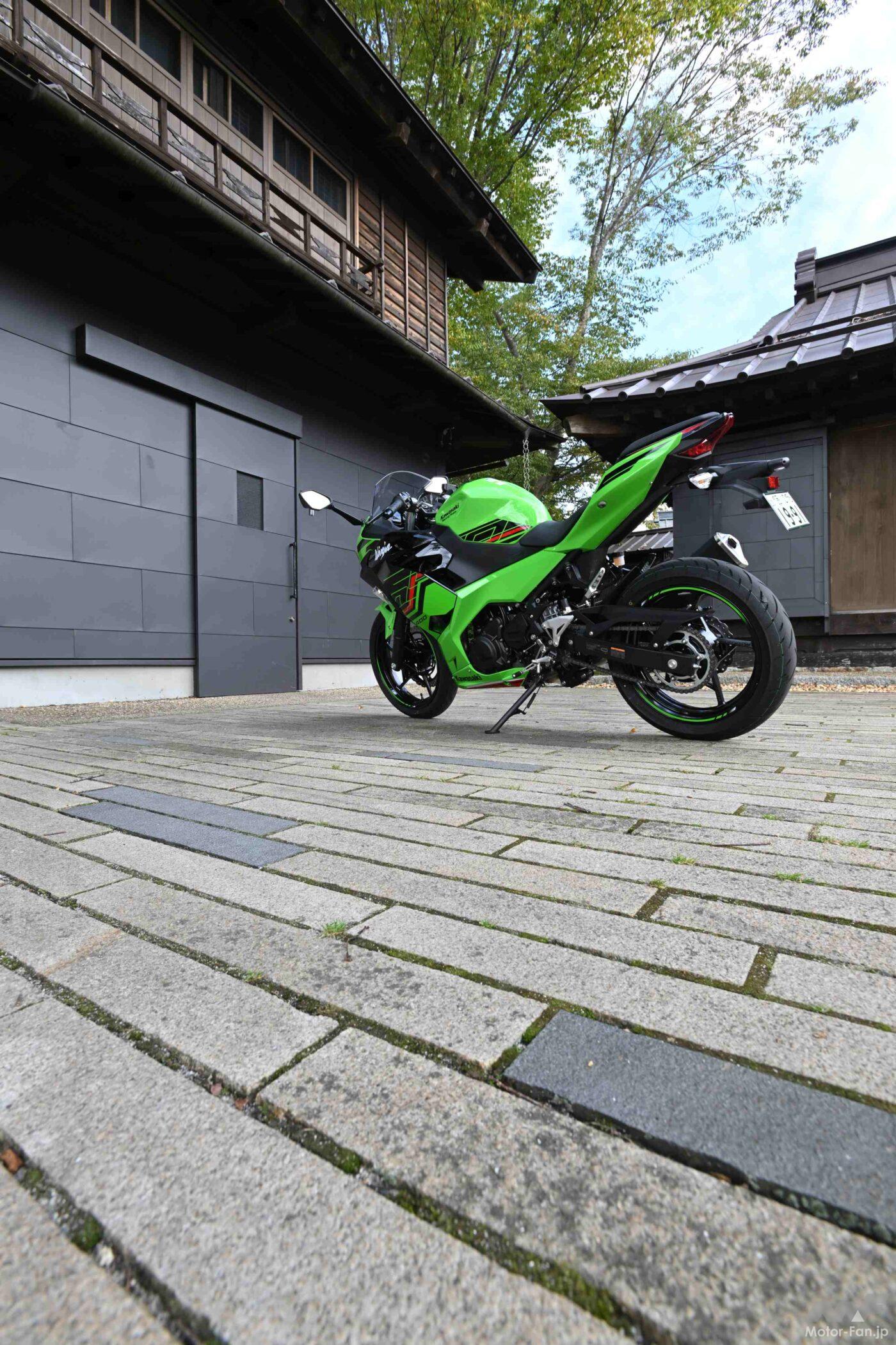 まあでも、近年の250ccフルカウルスポーツが自分にとって理想的なのかと言うと、必ずしもそうではない。何と言ってもTZR250の最高出力・装備重量が45ps・142kg、パワーウェイトレシオが3.15ps/kgだったのに対して、現代の250ccクラスで最も運動性能に優れるホンダCBR250RRは42ps・168kg・4ps/kgなのだから。そんなわけで、もう少しのパワーともう少しの軽さが実感できる現行車を探していた僕が、数年前の初試乗時に“コレだ‼”と感じたのが、48ps・167kg・3.48ps/kgの現行ニンジャ400なのである。
