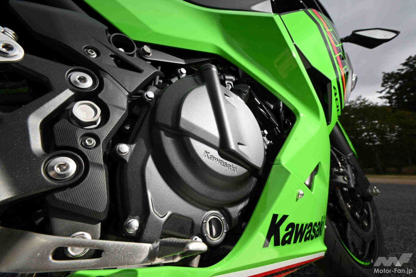 当記事の撮影兼ツーリングで久しぶりにニンジャ400を走らせた僕は、このバイクに好感を抱いた理由のひとつが、エンジンだったことを即座に認識。4スト400cc並列2気筒と言ったら、低中回転域からトルクフルで実直という印象を抱く人が多い気がするけれど(事実、CBR400RとYZF-R3はそういう特性で、4スト単気筒のRC390も味気は希薄だと思う)、ニンジャ400のエンジンは抑揚に富んでいて、低回転域では適度なドコドコ感、中~高回転域では左右気筒が力を合わせて駆け上っていくかのような爽快感が味わえるのだ。