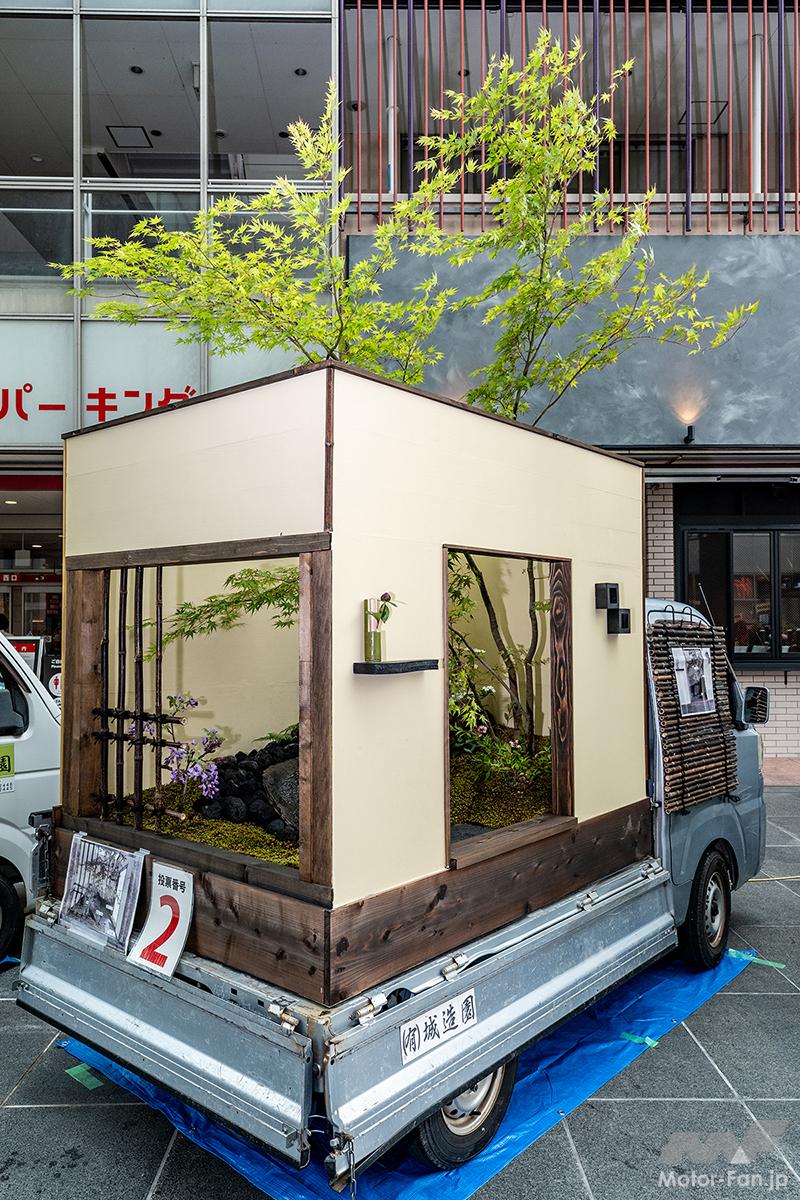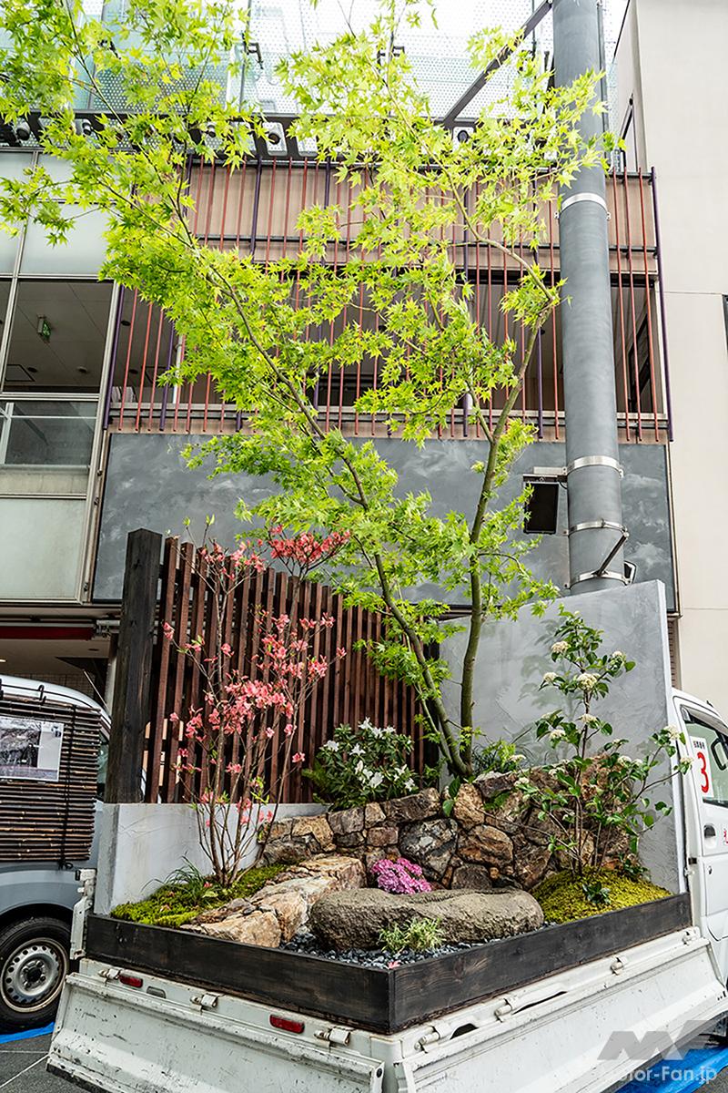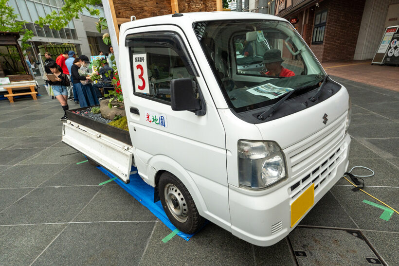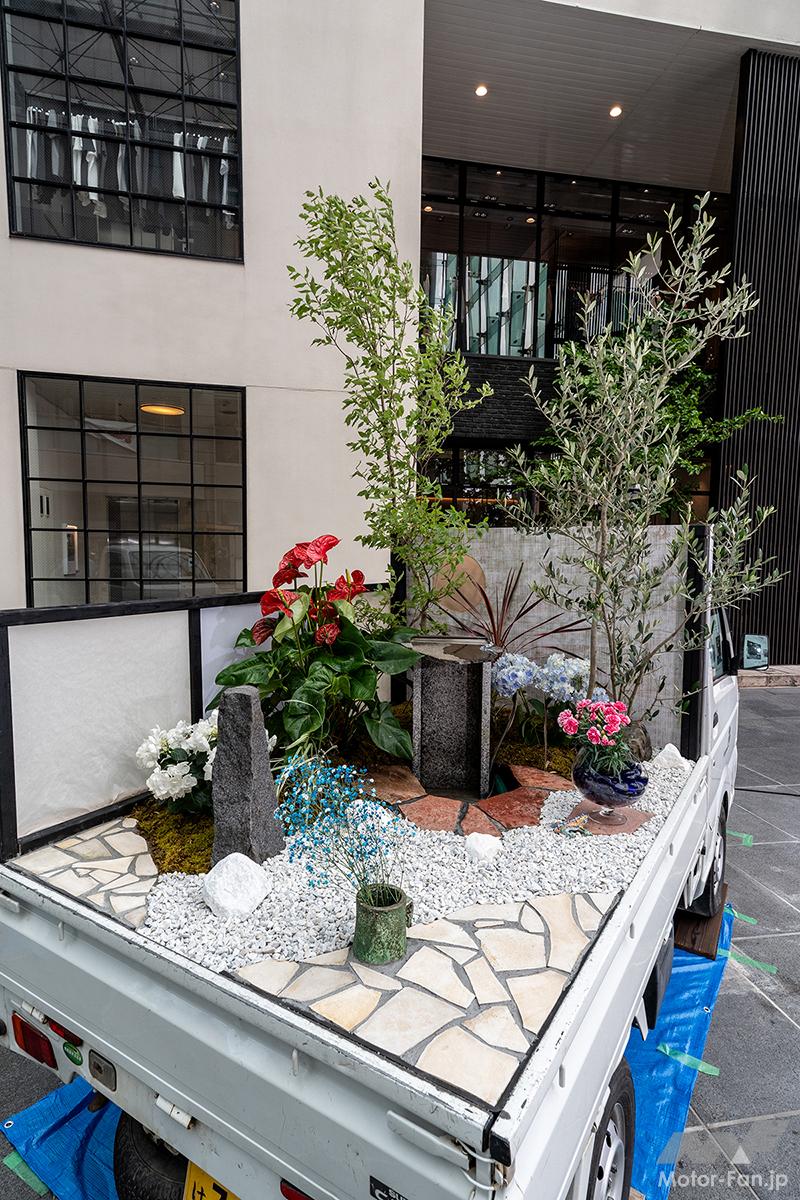 オフ会 【軽トラ庭園】美しすぎる和洋一体!? えっ軽トラックの荷台が植木鉢ってどういうこと?〘前編〙【写真・2枚目】 アンスリウムにカーネーション、アジサイにカスミソウ。コンセプトを理解したうえで庭園を眺めると和洋の一体化がよく分かる。 庭園の中央には水を循環させて水滴を滴らせ、ゆっくりと時の流れを刻むオブジェを設置。眺めているだけで心の平穏が得られそう。 DA16T CARRY西田幸寿園さん改めてハードに使い込まれた軽トラを見ていると日本の産業の裏側を陰ながら支えてくれているんだなぁと感慨もひとしお。 S500 HIJET中曽根造園さん運転席の窓ガラスには段階を追って構想を深めていった図面が掲載されており、実際の作品と見比べて感心するギャラリーさんもいらっしゃいました。 背後に建っている施設の建物が軽トラ庭園の壁および柵のデザインと似通っている辺り、なんか持ってるなーって感じですよね。 石垣とは異なる質感を持った船のような形状をした石は中央の凹みに水が張っていて、さり気なく花が浮いておりました。 DA16T CARRY光地園さん仕事柄、造園業のみなさんは軽トラの1台や2台は保有しているそうで、そこから軽トラ庭園の構想が生まれたらしいですよ。 四方を壁面で囲っているせいなのか、なぜか利休の茶室をイメージしてしまう。でも、部屋の中に木が生えてるんですよね。 S500 HIJET城造園さん庭園を構成している壁が見切れちゃってるじゃないですか。一応、車両が確認できるよう資料代わりに撮っておいたんですよー。 目に入るのはドス黒い玄武岩とカチ割られたベーコンのような樹木。見れば見るほど味わい深く感じてくるのは自分だけでしょうか!? 玄武岩以外にも岐阜の新白川砂利や香川の庵治石、能登の六方石などを敷き詰め、杉苔やヤブコウジで彩りを添えている。 DA16T CARRY 光地園さん仕事柄、造園業のみなさんは軽トラの1台や2台は保有しているそうで、そこから軽トラ庭園の構想が生まれたらしいですよ。 カッコーン…と日本庭園には欠かすことの出来ないシシオドシ(注:この竹筒は可動しません)なテイストも味わい深いコンテンツ。 TT2 SAMBAR/森新樹園さん この画像の記事を読む